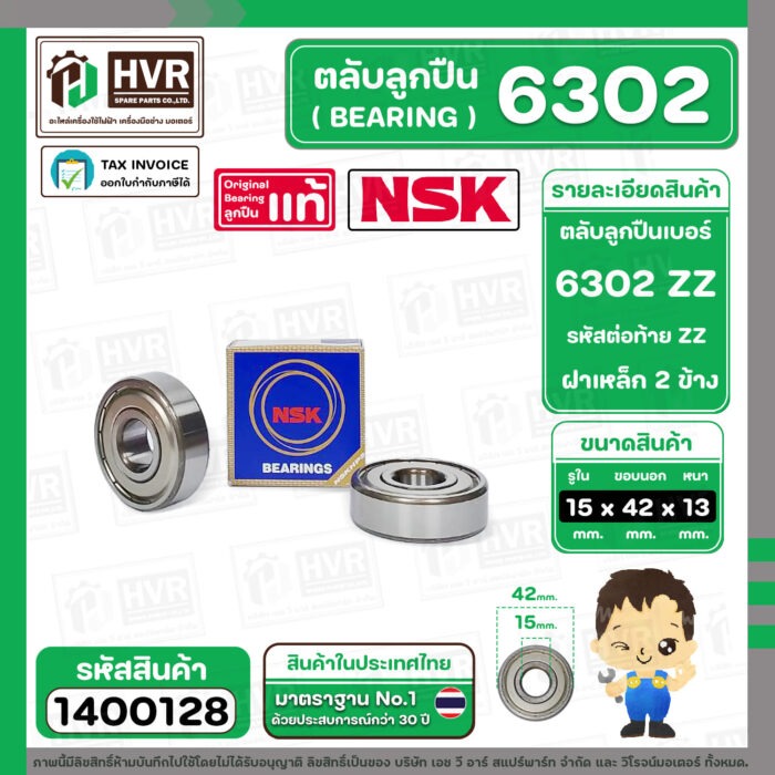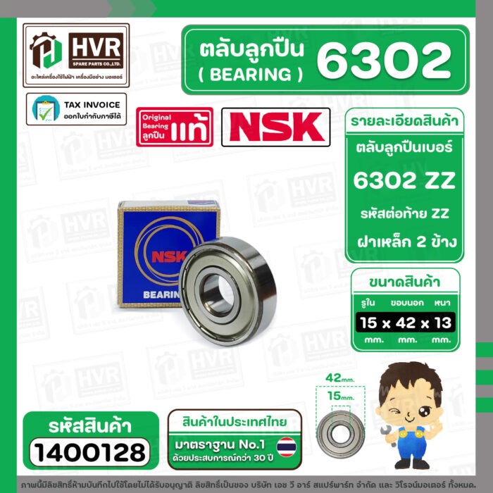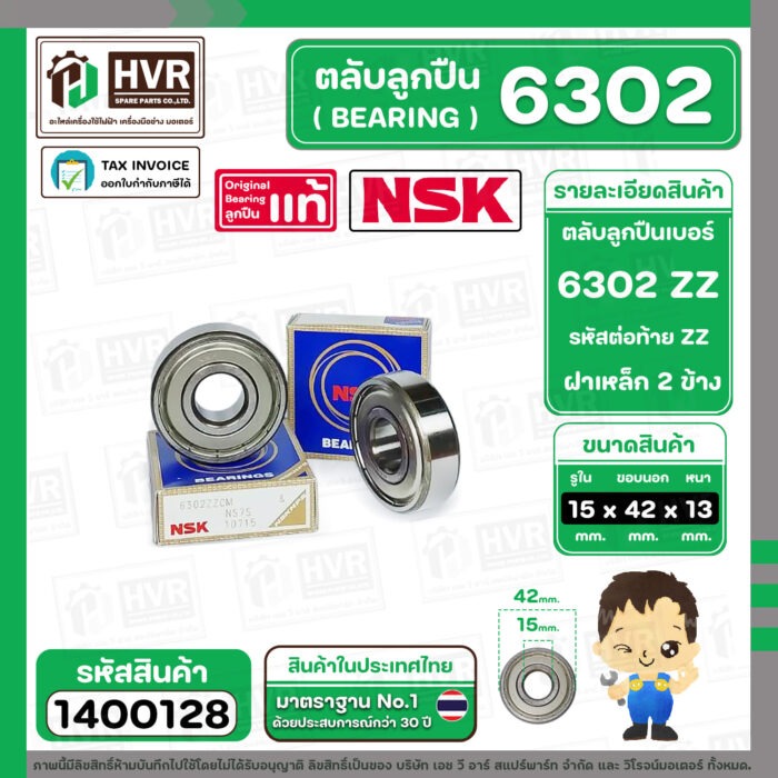 ตลับลูกปืน ( bearing ) 6302 ZZ ( ฝาเหล็ก ) ยี่ห้อ NSK คุณภาพดี มาตราฐาน JAPAN ( 15 x 42 x 13 mm. ) ( ราคา / 1 ตลับ ) #140061