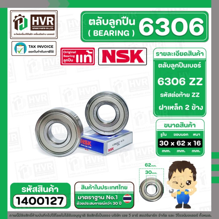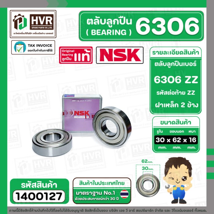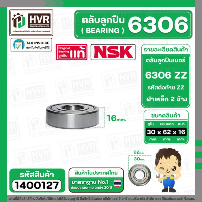 ตลับลูกปืน ( bearing ) 6306 ZZ ( ฝาเหล็ก ) ยี่ห้อ NSK คุณภาพดี มาตราฐาน JAPAN ( 30 x 62 x 16 mm. ) ( ราคา / 1 ตลับ ) #1400127