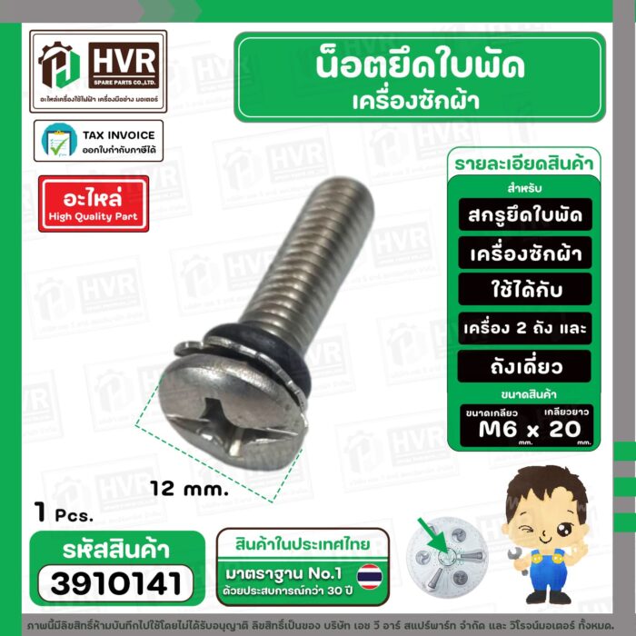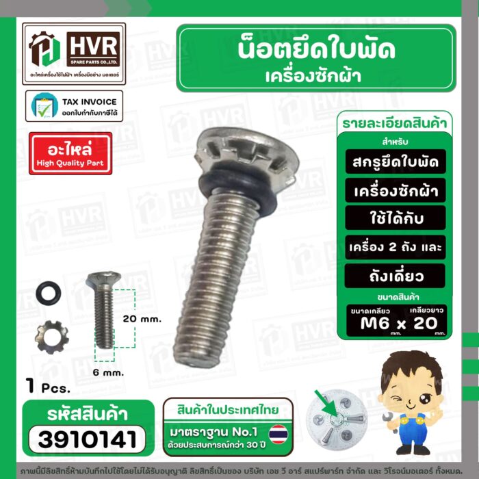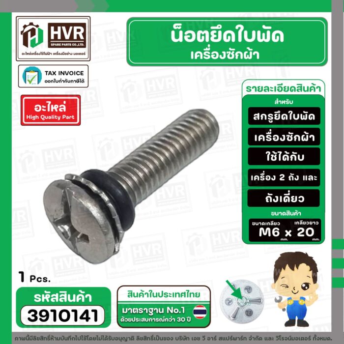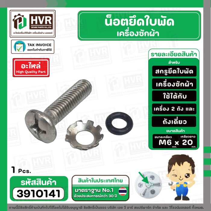 น็อตยึดใบพัดเครื่องซักผ้า LG , Panasonic , SAMSUNG , HITACHI และ ทั่วไป เกลียว M6 x ยาว 20 mm. ( สกรู + แหวน + โอลิง )