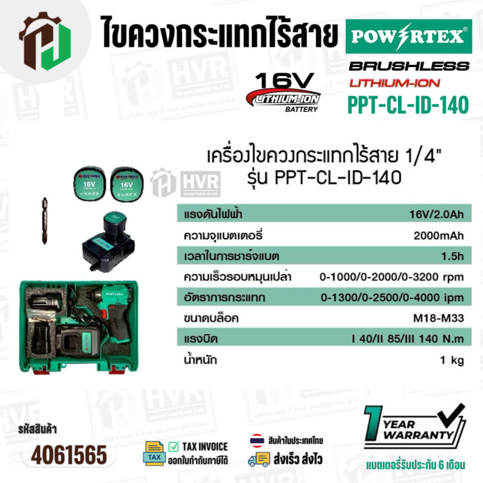 สว่านไร้สาย 10mm. POWERTEX รหัสสินค้า PPT-CL-CD-10-BL ( BRUSHLESS )