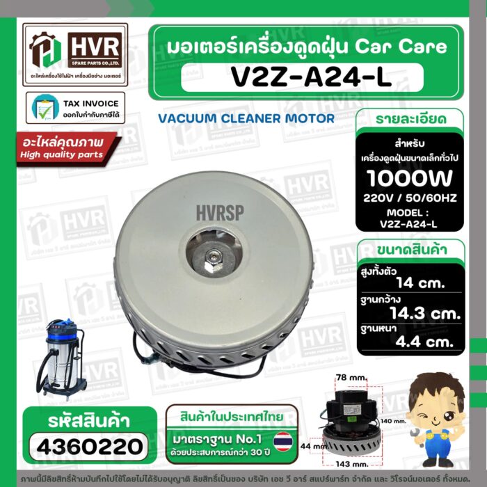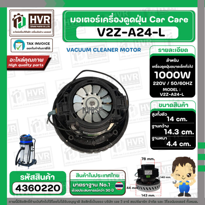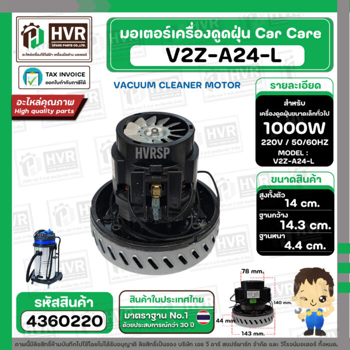 “มอเตอร์ดูดฝุ่นอุตสาหกรรม งาน Car Care 1000W 220V ( V2Z-A24-L ) ( ฐาน : 14.3 cm. สูง 14 cm. ฐานหนา 4.4 cm.)