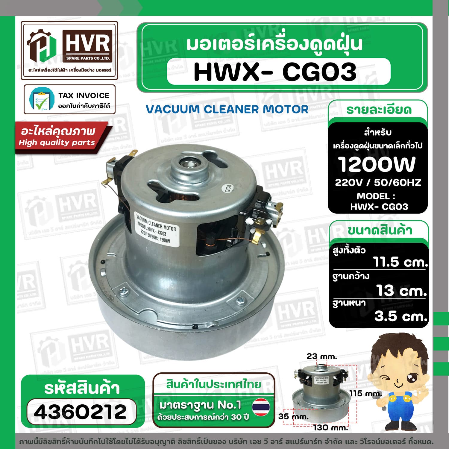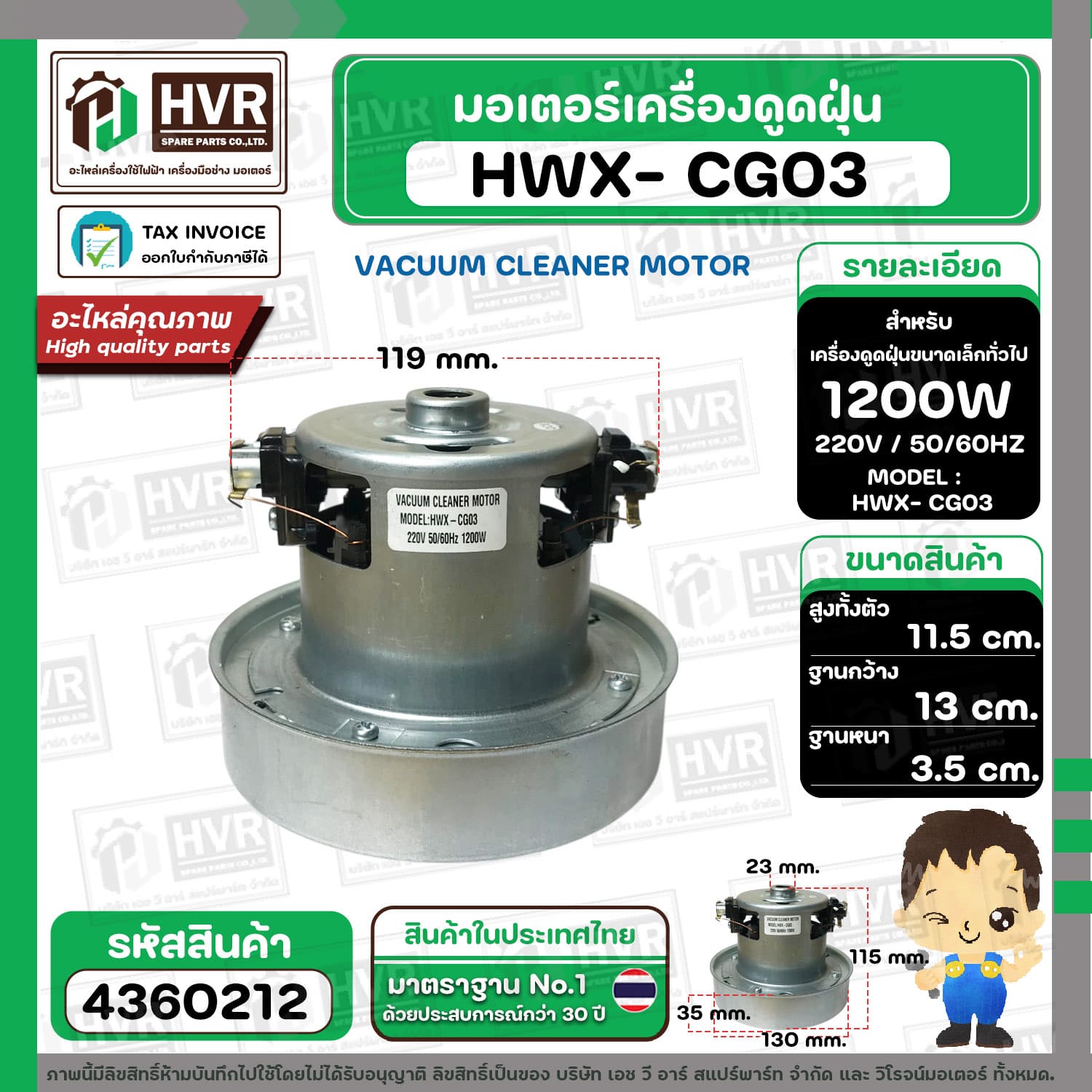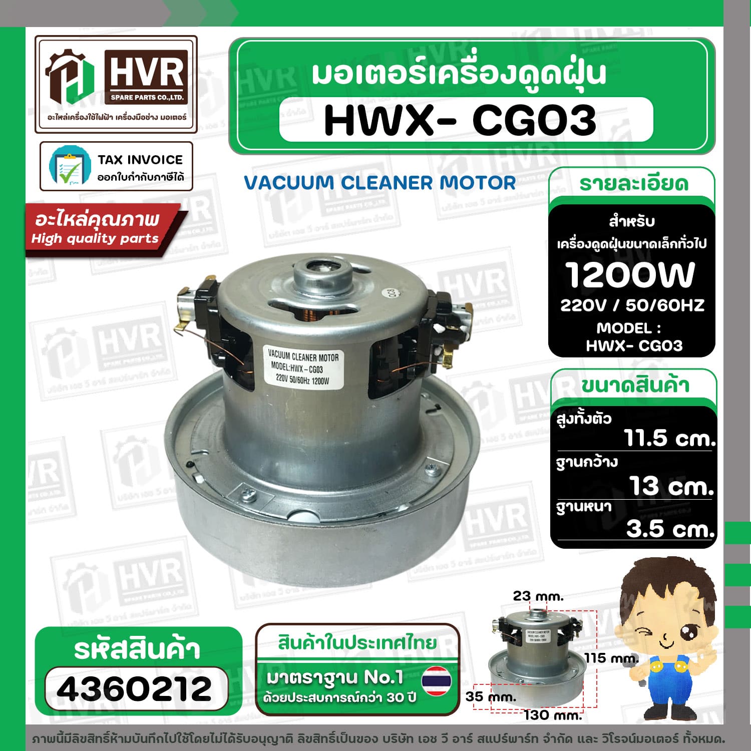 มอเตอร์ดูดฝุ่น ทั่วไป 1200W 220V ( HWX-P (CG-03) ) ( ฐาน : 13 cm. สูง 11.5 cm. ฐานหนา 3.5 cm.) #4360212