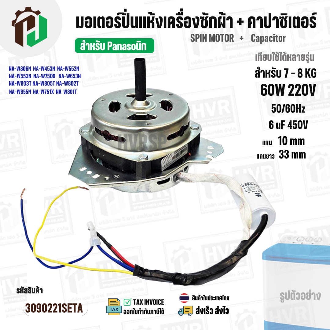 มอเตอร์ปั่นแห้งเครื่องซักผ้า Panasonic NA-W653N , NA-W750X , NA-W803T ,NA-W805T , NA-W806N ( 7 – 8 KG ) 60W มาพร้อม Cap 6 uf (ทรงคางหมู ) ( AL ) #3090221SETA