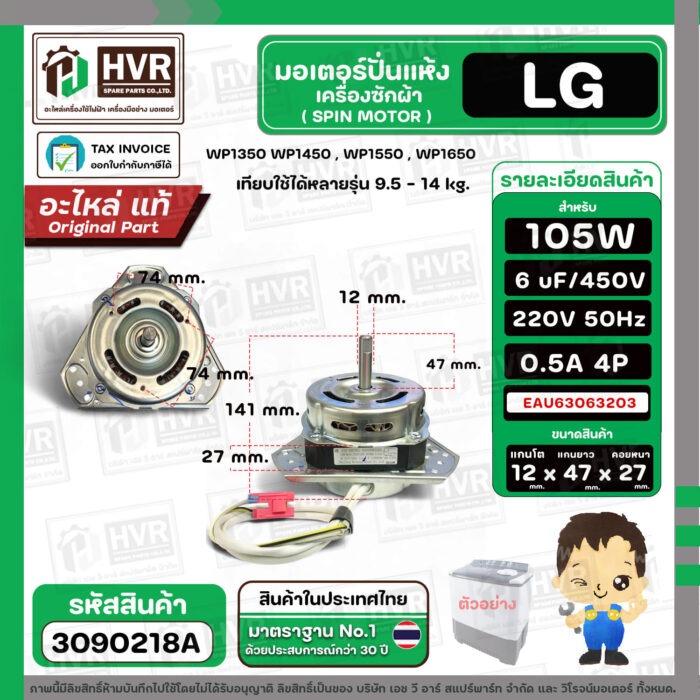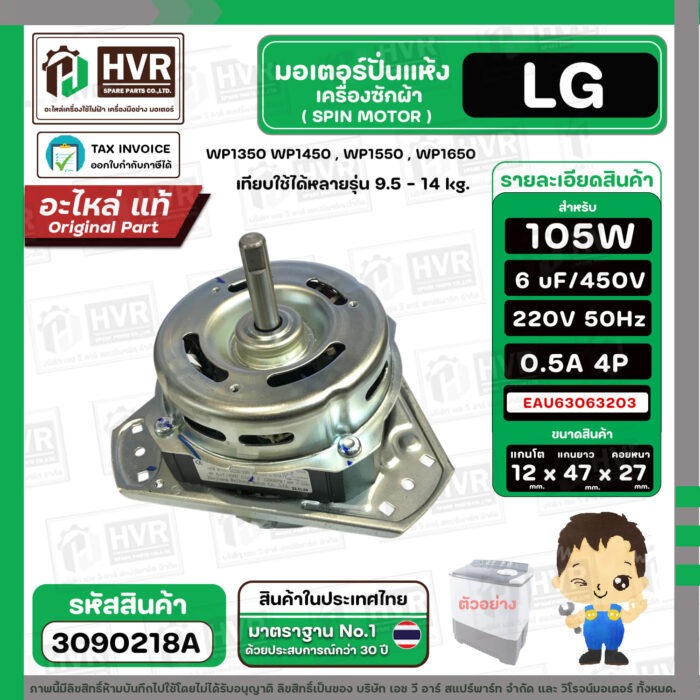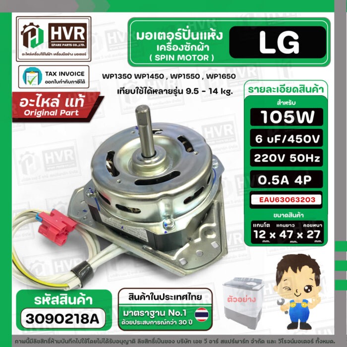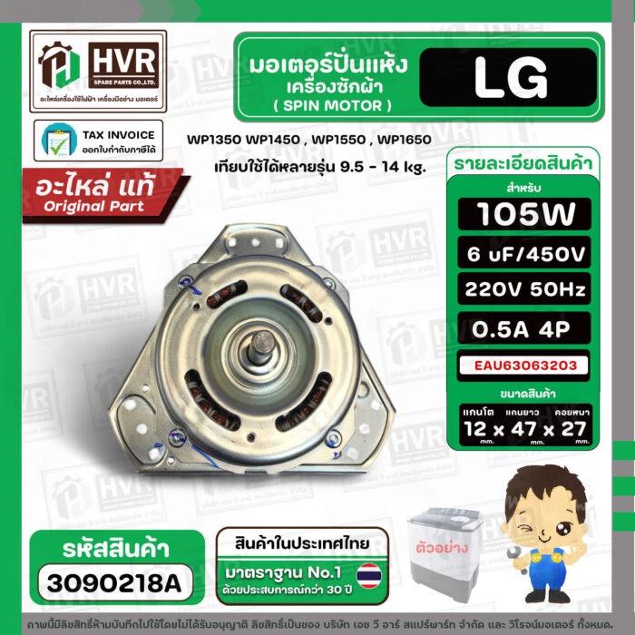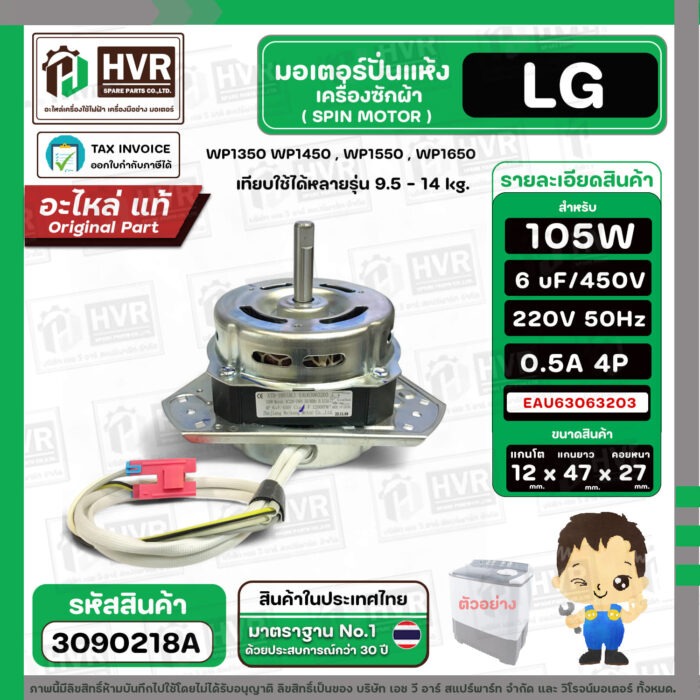 มอเตอร์ปั่นแห้ง เครื่องซักผ้าสำหรับ LG ขนาด 9.5 – 14 kg ( แกน 12 mm. 105W 220V 6 uF ) EAU63063203 ( แท้ ) #3090218A