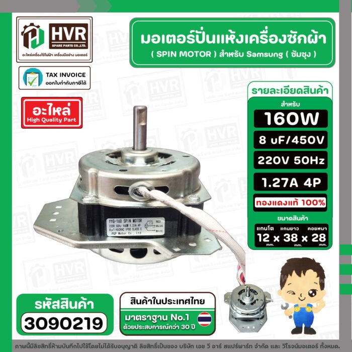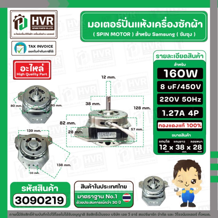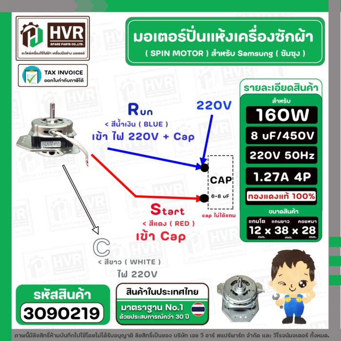 มอเตอร์ปั่นแห้ง SAMSUNG WT15J7 , WT16J8 ( 3 ปีก ) ( คางหมู ) ( 160W ) 8 uF แกน 12 mm. ( ทองแดงแท้ 100% )