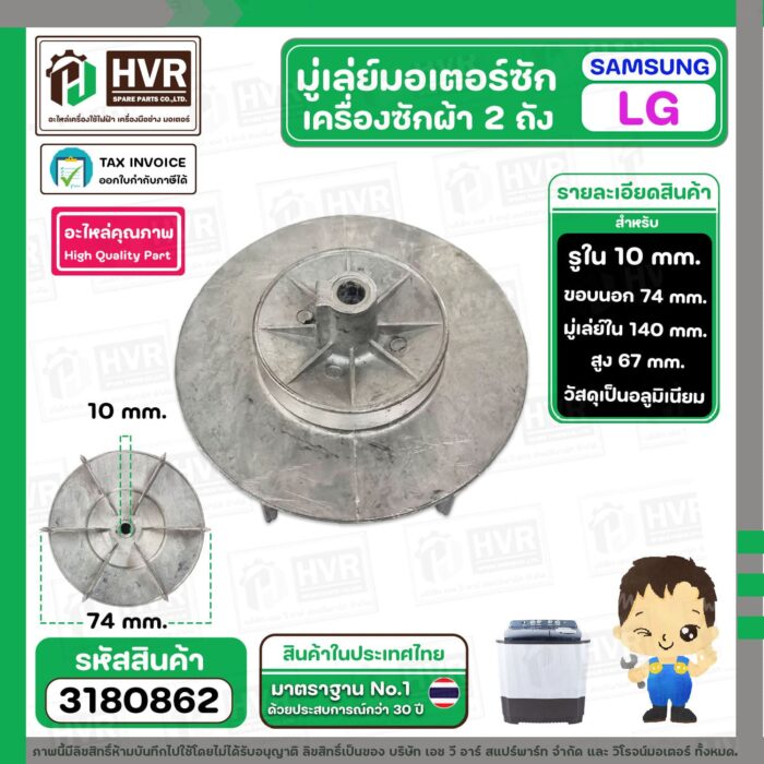 มู่เล่ มอเตอร์ซัก เครื่องซักผ้า LG , SAMSUNG รู 10 mm. มู่เล่ใน 74 mm. ขอบใบพัด 140 mm. สูง 67 mm. #3180862