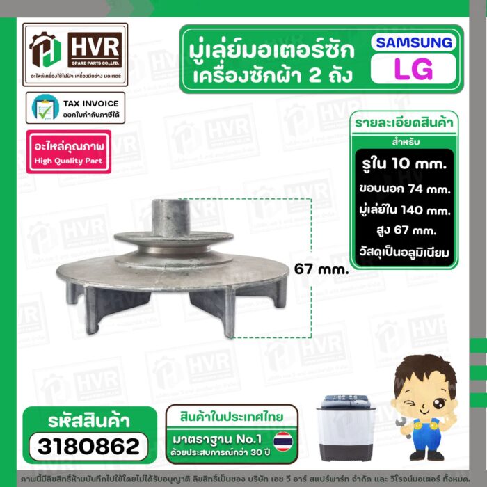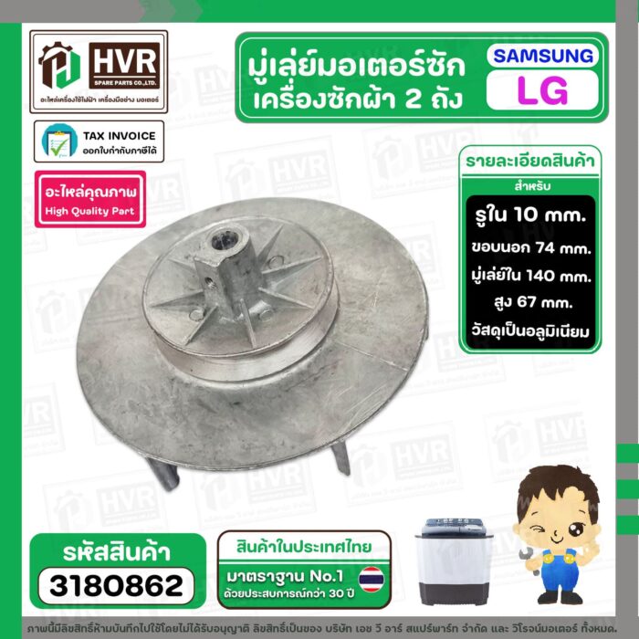 มู่เล่ยื มอเตอร์ซัก เครื่องซักผ้า LG , SAMSUNG รู 10 mm. มู่เล่ใน 74 mm. ขอบใบพัด 140 mm. สูง 67 mm. #3180862