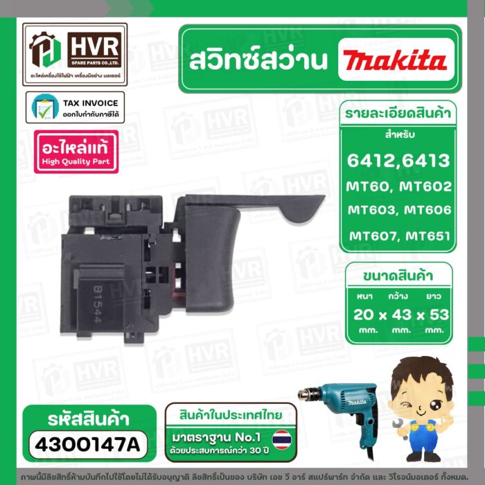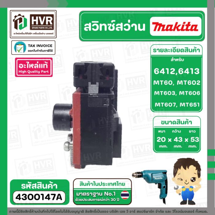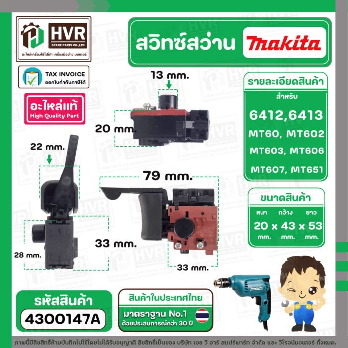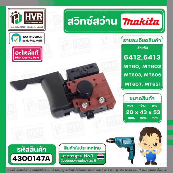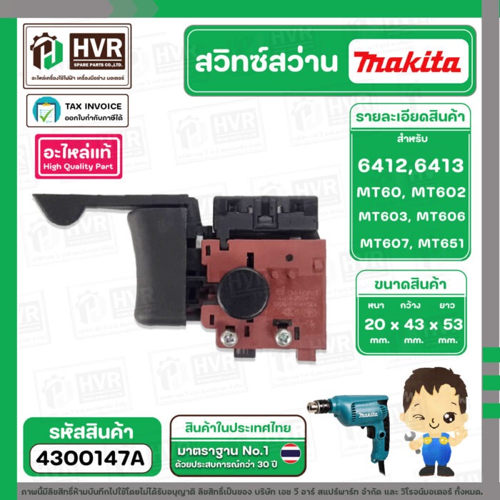 >> ใช้ได้กับสว่านรุ่น สวิทซ์ MAKITA 6412 NO.19 , MT60, MT602, MT603, MT606, MT607, MT651 M6001, HP1630, 6413, M6501, M8100 MT653, MT814 ( แท้ ) ( ใช้สวิทซ์ตัวเดียวกัน )