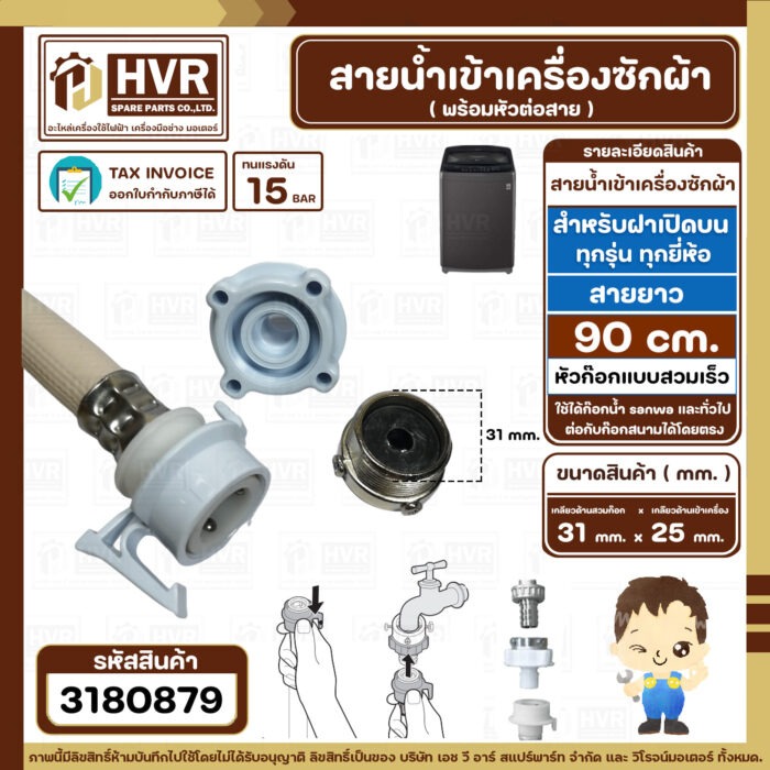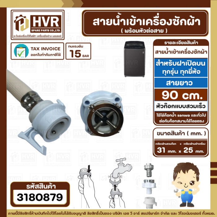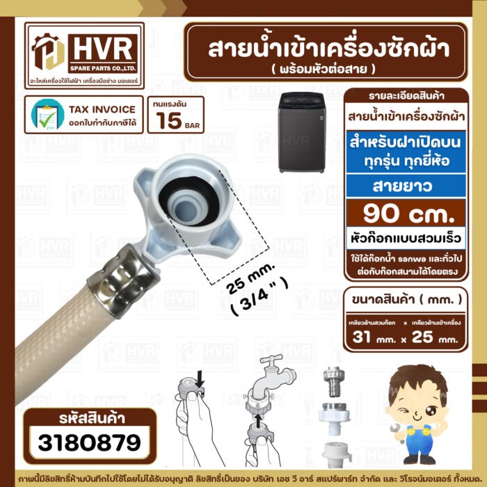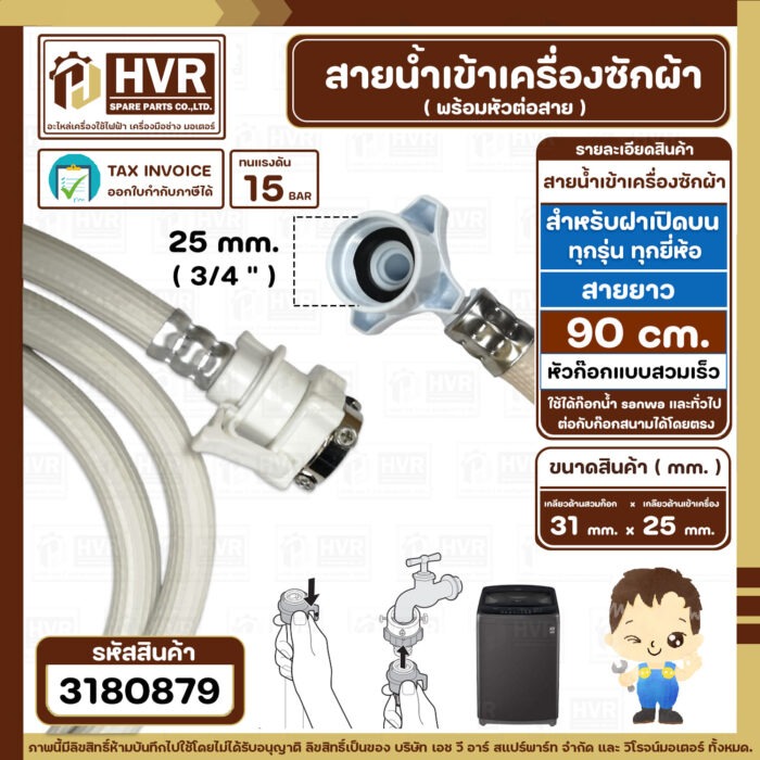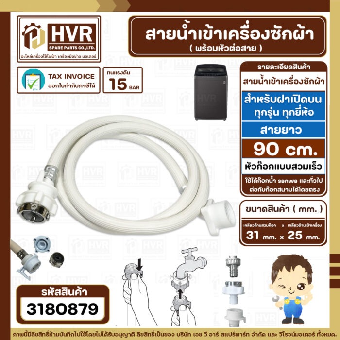 สายน้ำเข้าเครื่องซักผ้า ( INLET ) 0.9 เมตร เกลียวเข้าเครื่อง 3/4″ ( 25 mm. ) x ( ก๊อกสวมเร็ว ) ( แท้ )(ราคา/ 1 เส้น) #3180879