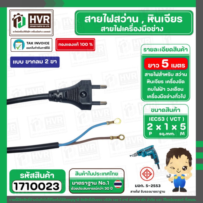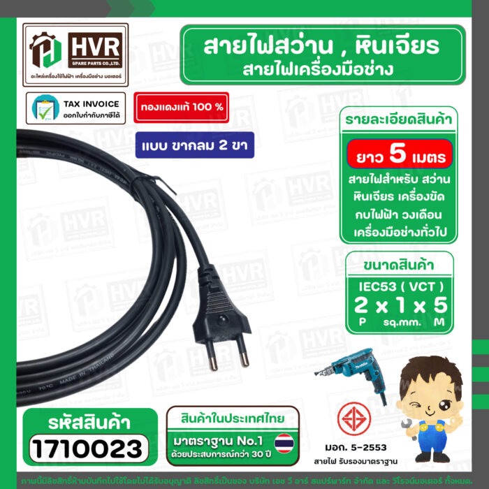 สายไฟสำเร็จรูป สว่าน หินเจียร เครื่องมือช่าง 2 x 1 x 5 M ( ยาว 5 เมตร ) ขากลม 2 ขา มอก. ( แบบเต็ม ทองแดงแท้ 100 % )