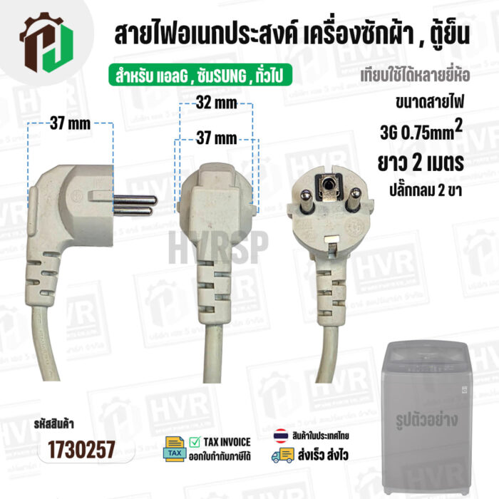 สายไฟ AC สำเร็จรูปอเนกประสงค์ สำหรับเครื่องซักผ้า , ตู้เย็น และ ทั่วไป พร้อมปลั๊ก 2 ขา กลม ( สีขาว ) 3 x 0.75sq. mm x ยาว 2 เมตร #1730257