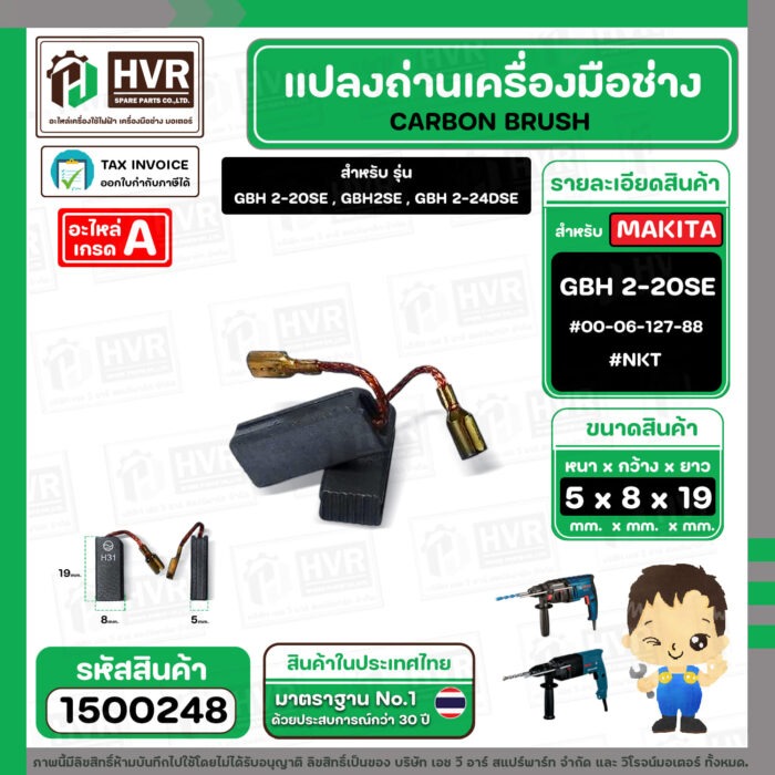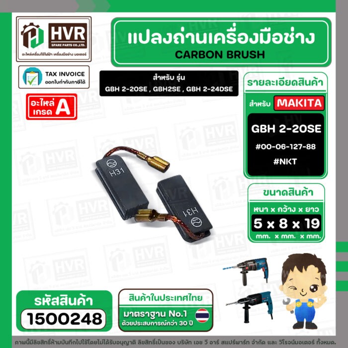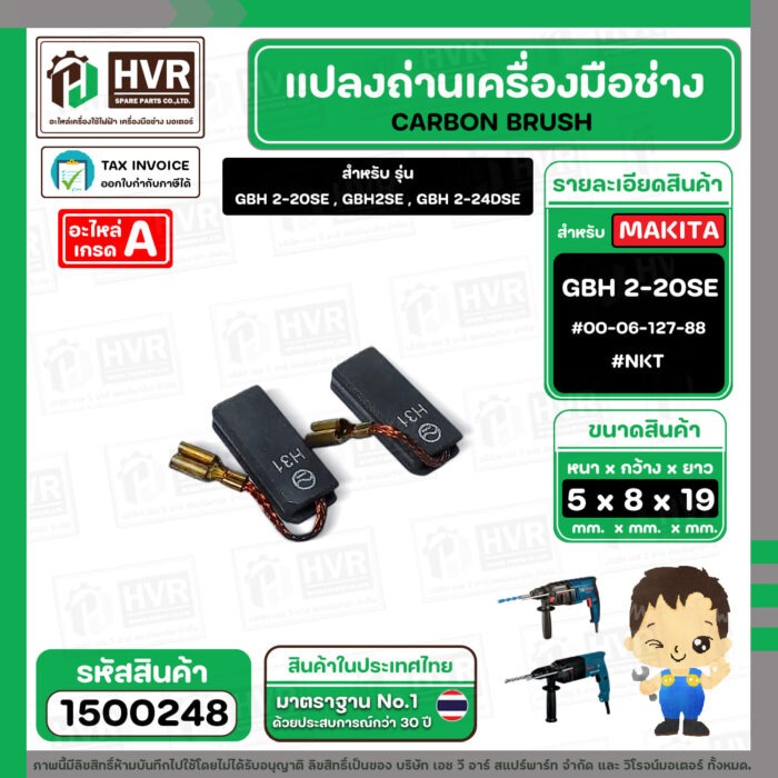 แปรงถ่าน สำหรับ BOSCH GBH 2-20SE , GBH2SE , GBH 2-24DSE ( NKT ) ( 5 x 8 x 19 ) #00-06-127-88 (ราคา / 1 ชุด) #1500248