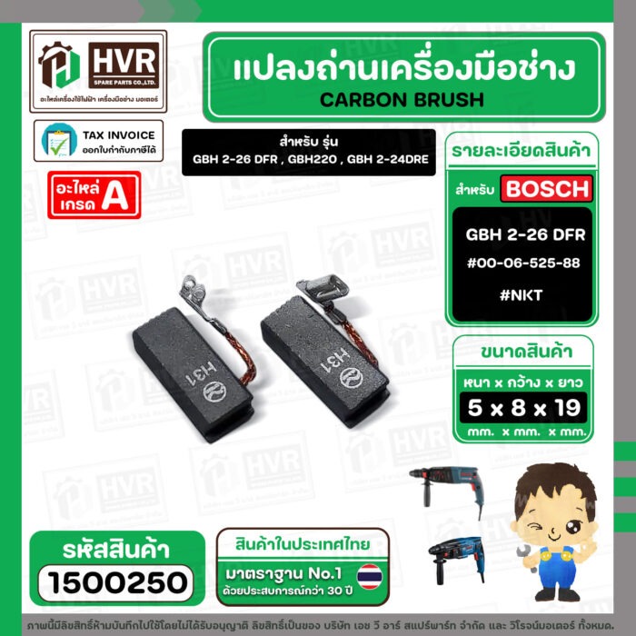 แปรงถ่าน สำหรับ BOSCH GBH 2-26 DFR , GBH220 , GBH 2-24DRE ( NKT ) ( 5 x 8 x 19 ) #00-06-525-88 (ราคา / 1 ชุด) #1500250