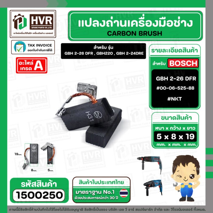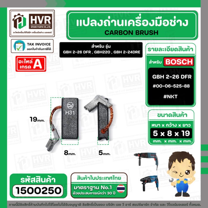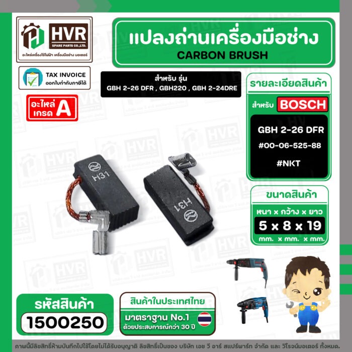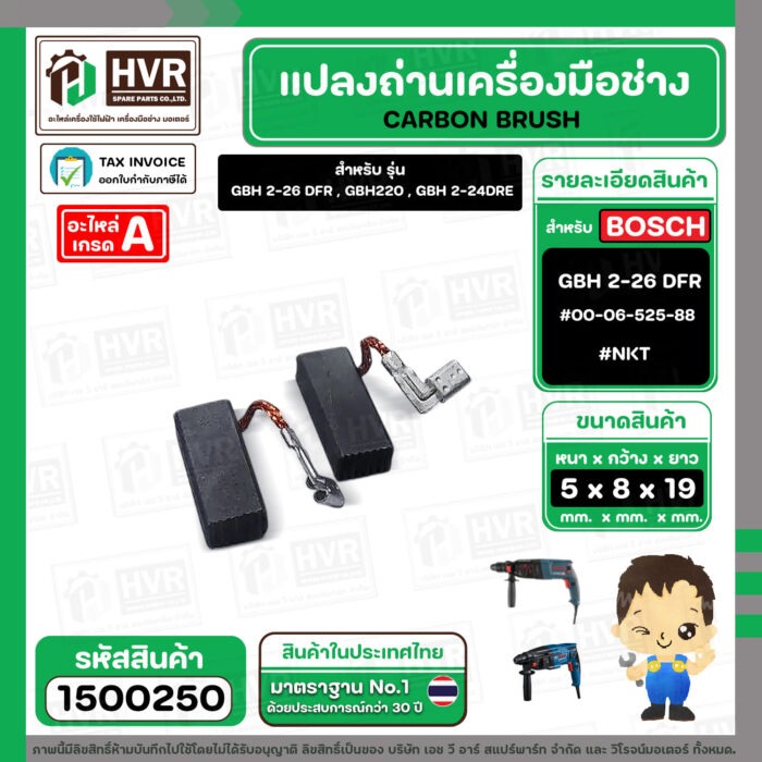 แปรงถ่าน สำหรับ BOSCH GBH 2-26 DFR , GBH220 , GBH 2-24DRE ( NKT ) ( 5 x 8 x 19 ) #00-06-525-88 (ราคา / 1 ชุด)