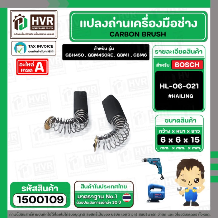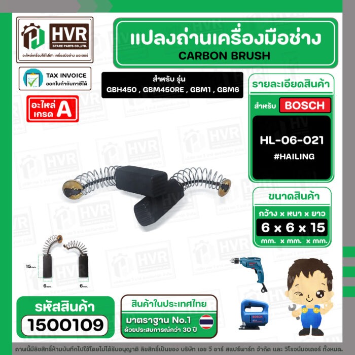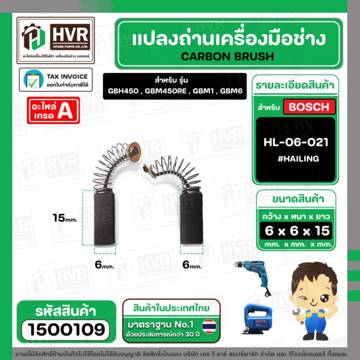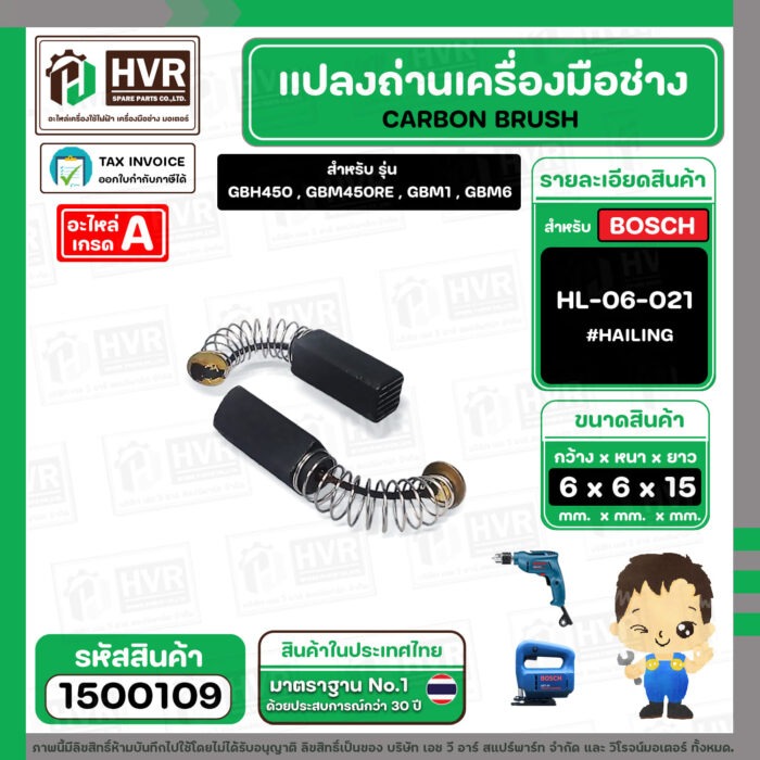 แปรงถ่าน สำหรับ BOSCH GBH450 , GBM6RE , GST54 ( HAILING ) ( 6.3 x 6.3 x 15.5 ) #HL-06-021 (ราคา / 1 ชุด) #1500109