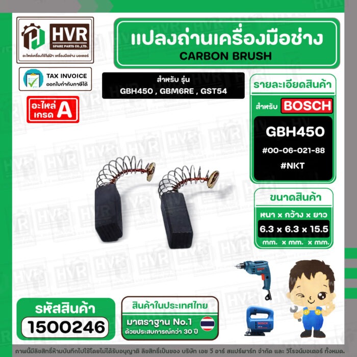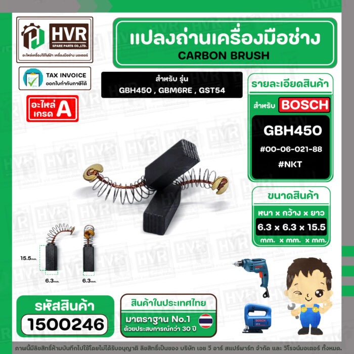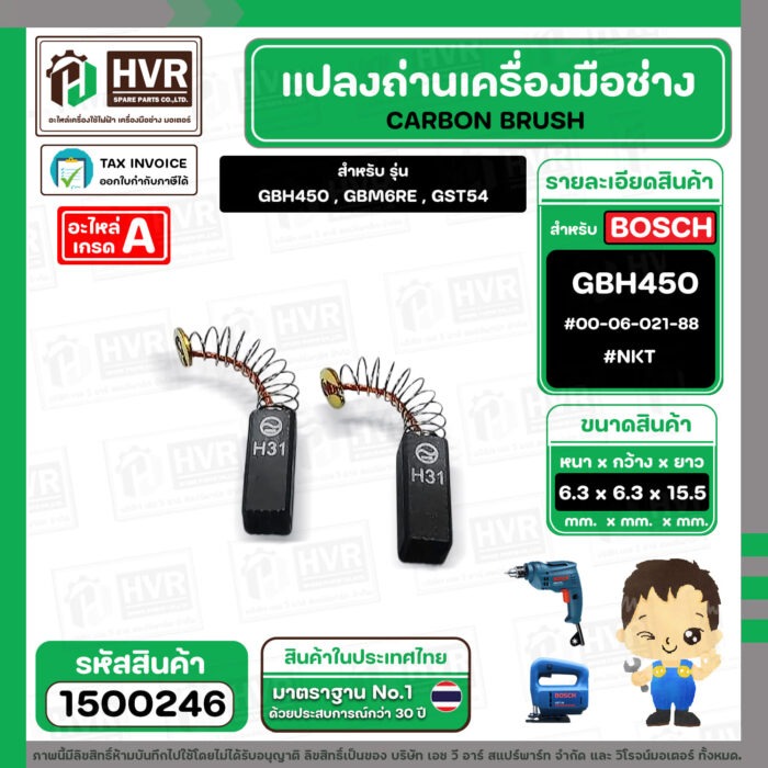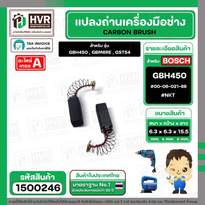 แปรงถ่าน สำหรับ BOSCH GBH450 , GBM6RE , GST54 ( NKT ) ( 6.3 x 6.3 x 15.5 ) #00-06-021-88 (ราคา / 1 ชุด) #1500246