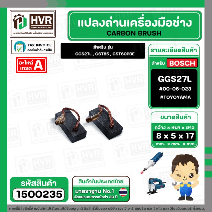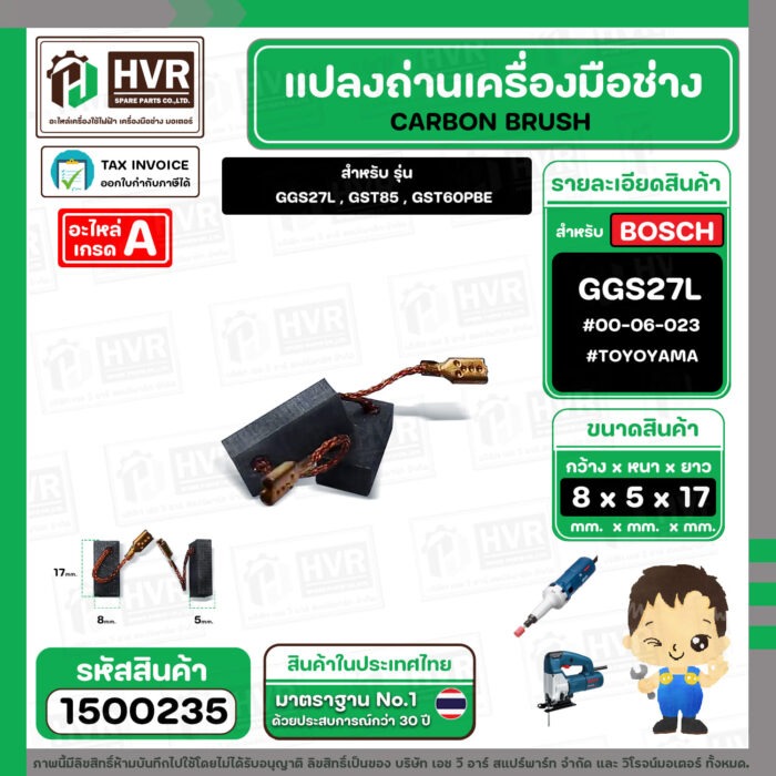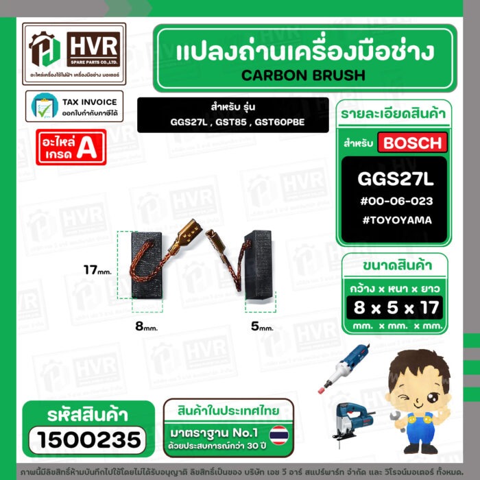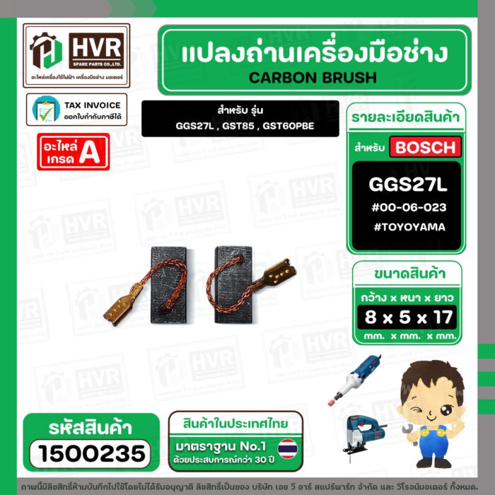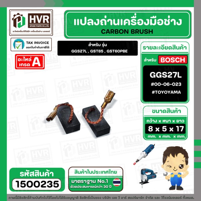 แปรงถ่าน สำหรับ BOSCH GGS27L , GST85 , GST60PBE (TOYOYAMA ) ( 5 x 8 x 17 ) #00-06-023 (ราคา / 1 ชุด) #1500235