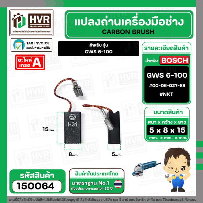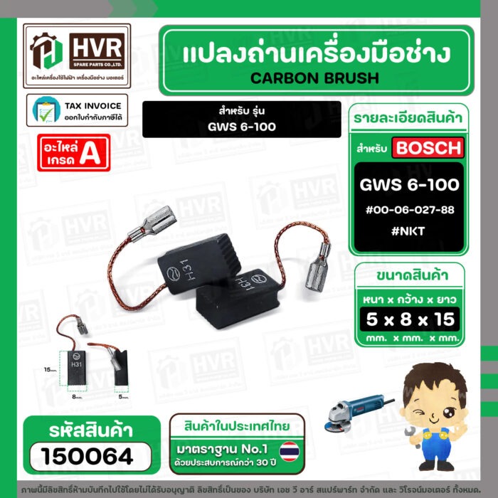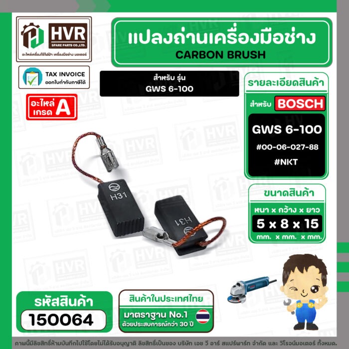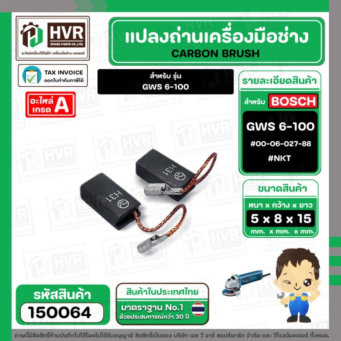 แปรงถ่าน สำหรับ BOSCH GWS 6-100 ,GWS8-100, GWS 060 , GWS750-100 ( NKT ) ( 5 x 8 x 15 ) #00-06-027-88 (ราคา / 1 ชุด)