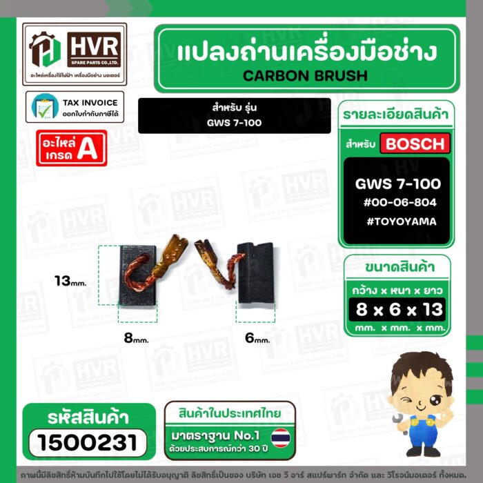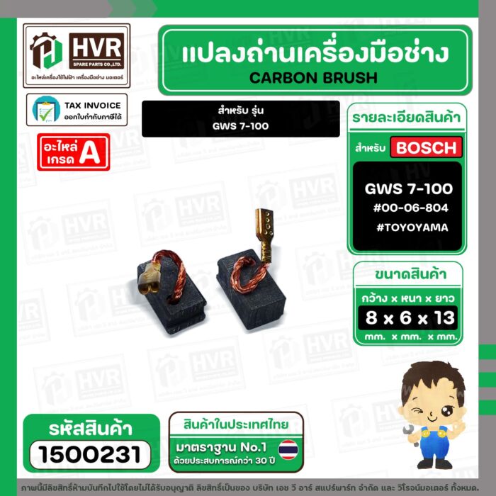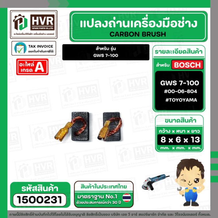 แปรงถ่าน สำหรับ BOSCH GWS 7-100 ( TOYOYAMA ) ( 6.5 x 8 x 13 mm. ) #00-06-804 (ราคา / 1 ชุด) #1500231