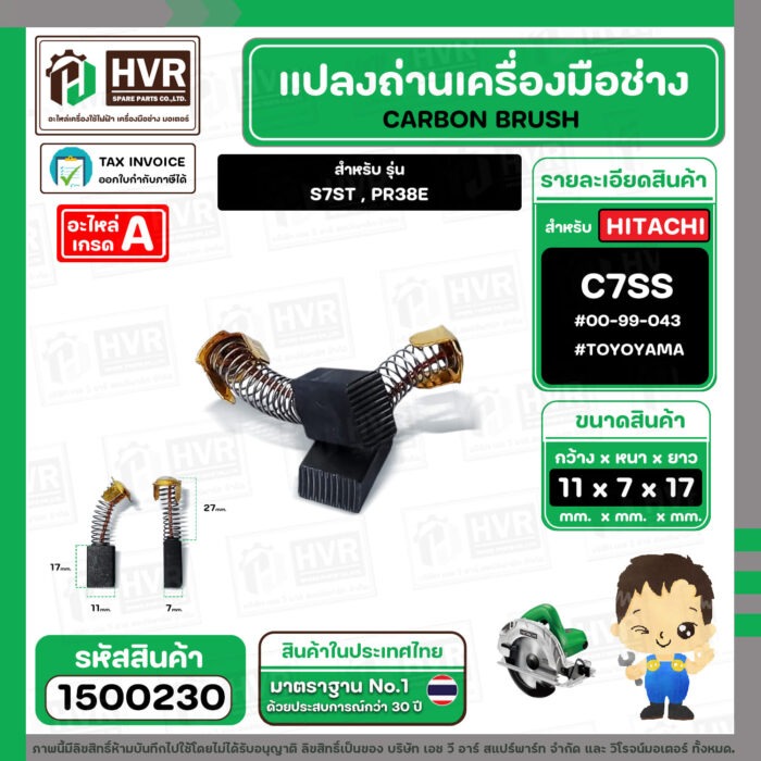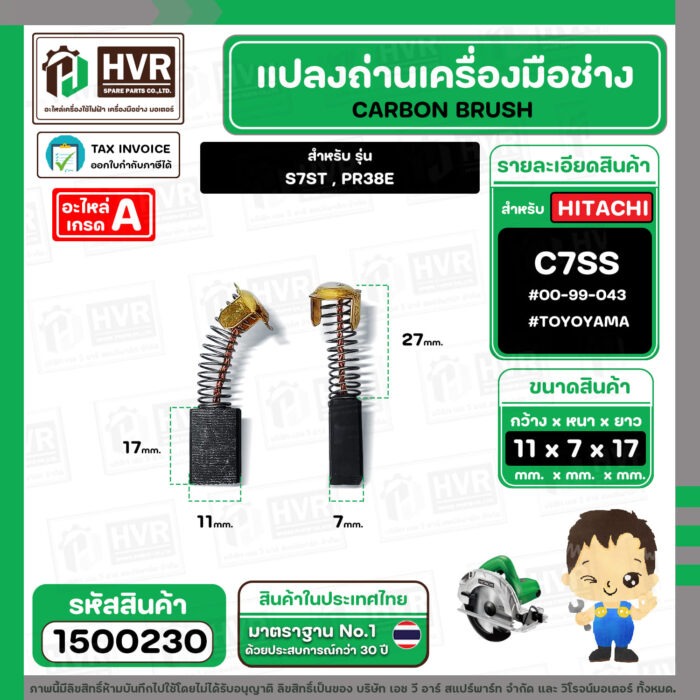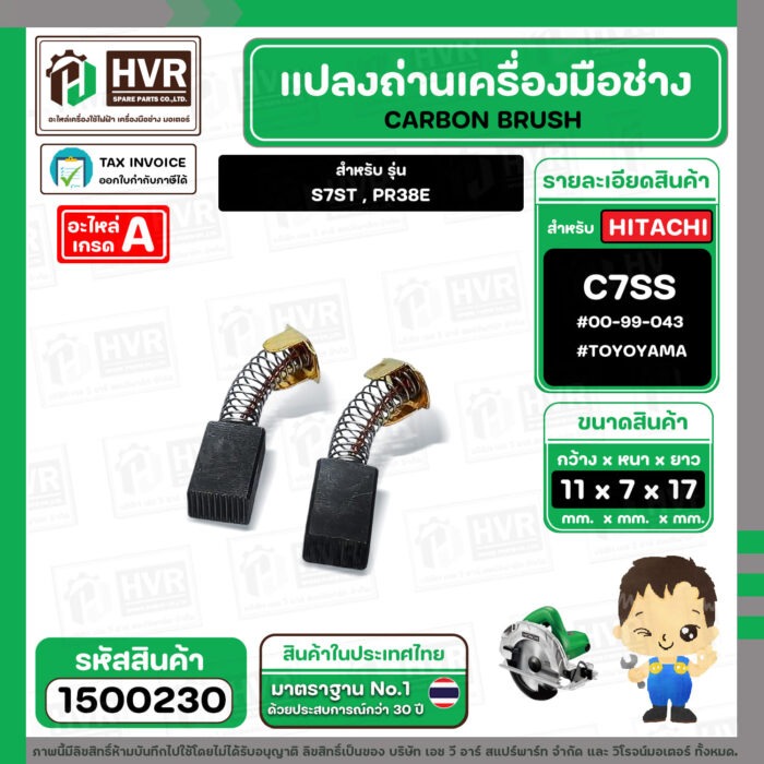 แปรงถ่าน สำหรับ HITACHI C7SS , S7ST , PR38E ( TOYOYAMA ) ( 7 x 11 x 17 mm. ) #00-99-043 (ราคา / 1 ชุด) #1500230