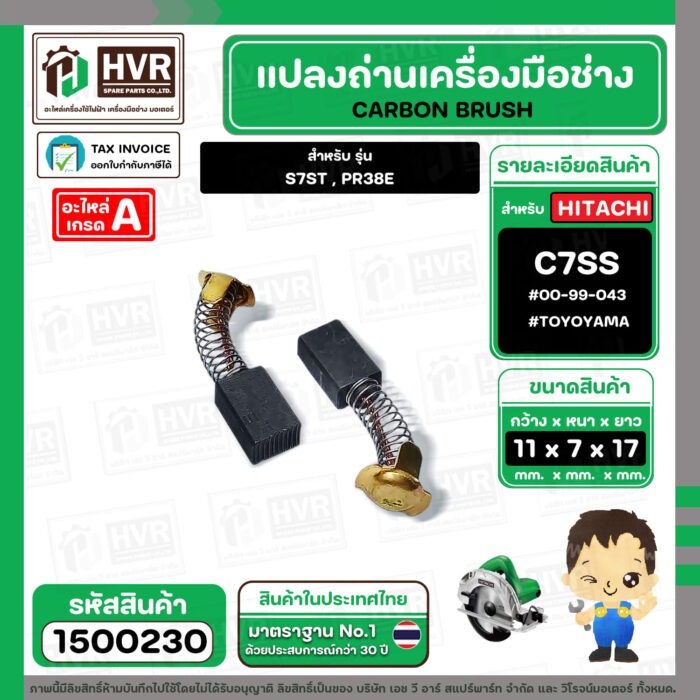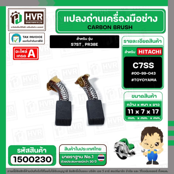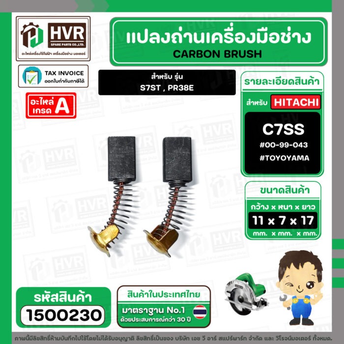 แปรงถ่าน สำหรับ HITACHI C7SS , S7ST , PR38E ( TOYOYAMA ) ( 7 x 11 x 17 mm. ) #00-99-043 (ราคา / 1 ชุด)
