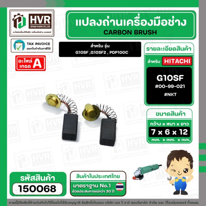 แปรงถ่าน สำหรับ HITACHI G10SF ,G10SF2 , PDP100C ( NKT ) ( 6.5 x 7.5 x 12 mm. ) #00-99-021 (ราคา / 1 ชุด) #150068