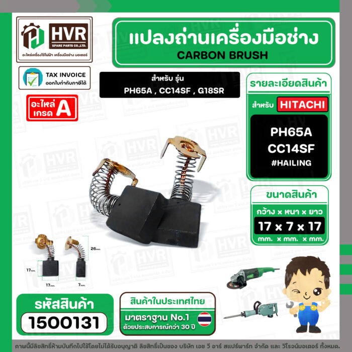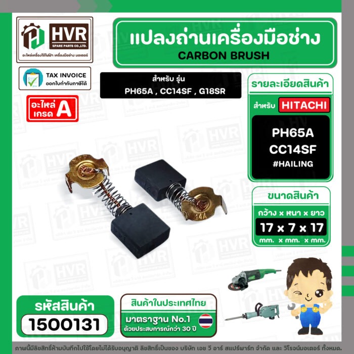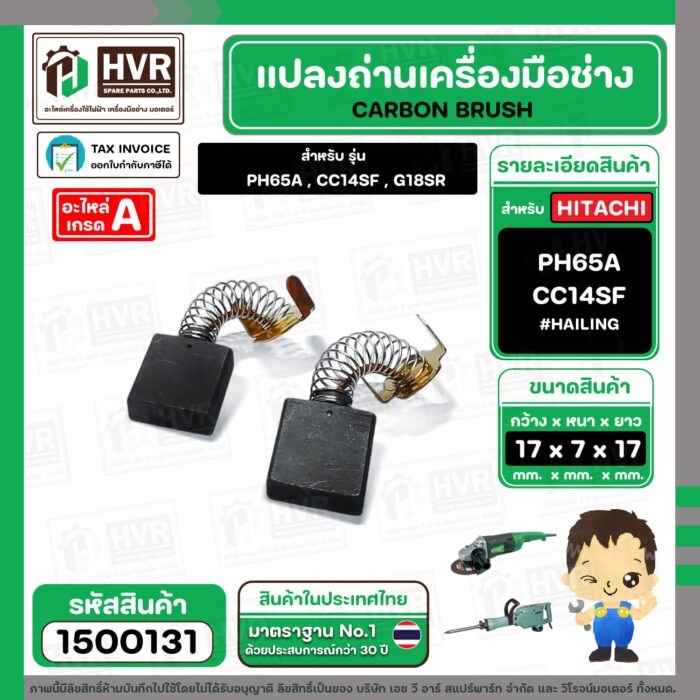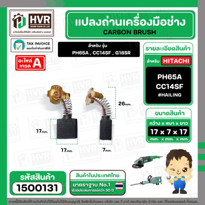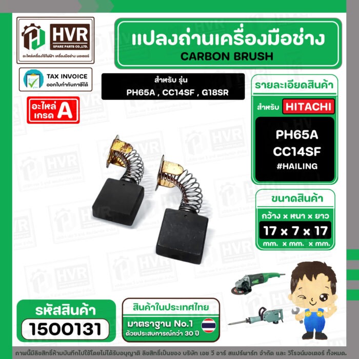 แปรงถ่าน สำหรับ HITACHI PH65A , CC14SF ,G18SR ( HAILING ) ( 7 x 17 x 17 mm.) (AUTO CUT)(ราคา / 1 ชุด) #1500131