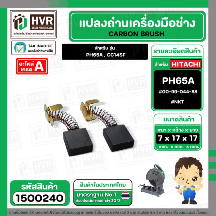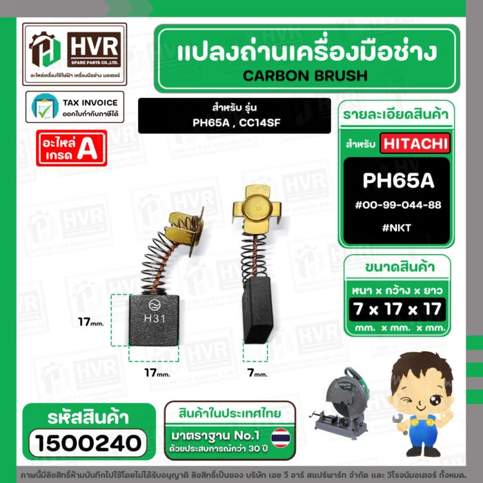 แปรงถ่าน สำหรับ HITACHI PH65A , CC14SF ( NKT ) ( 7 x 17 x 17 mm. ) #00-99-044-88 (ราคา / 1 ชุด) #1500240