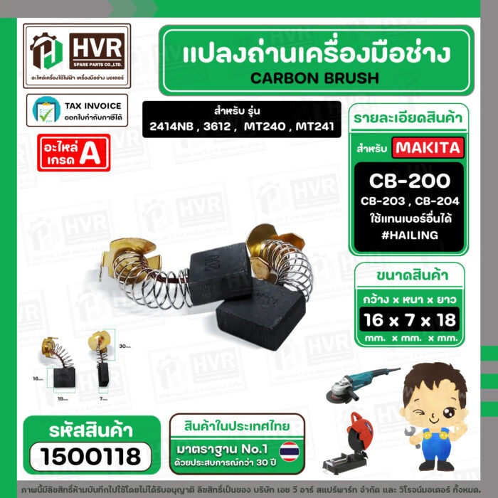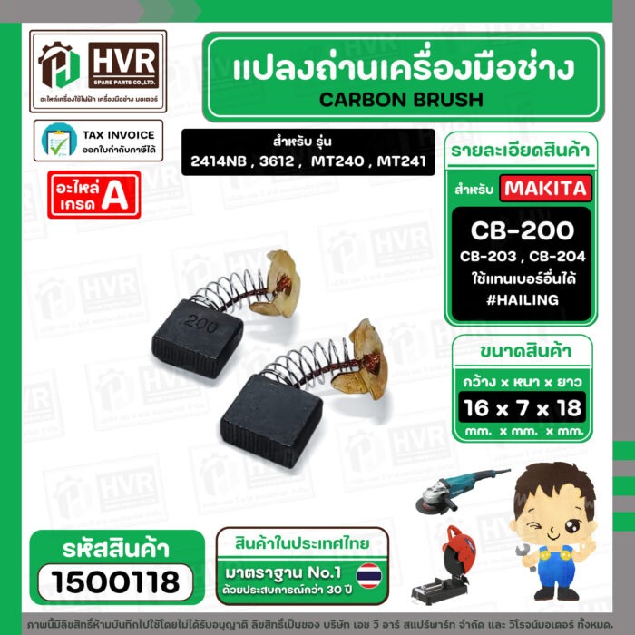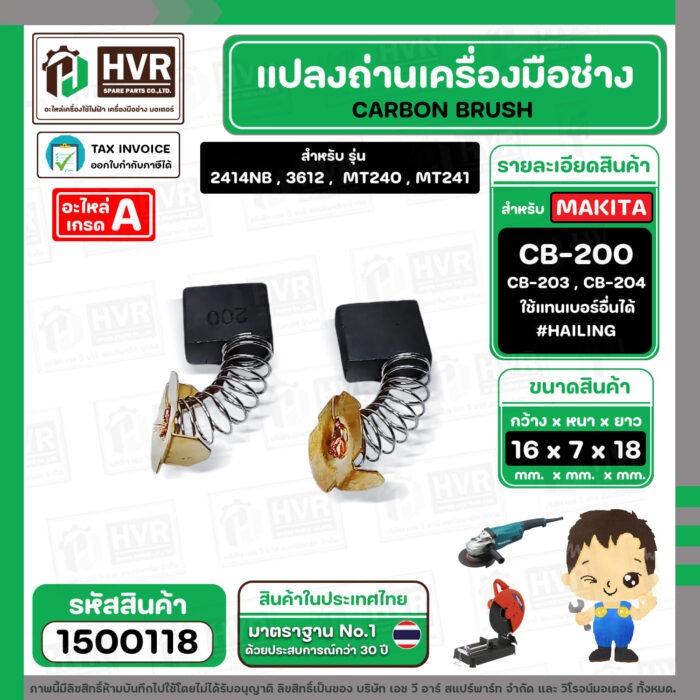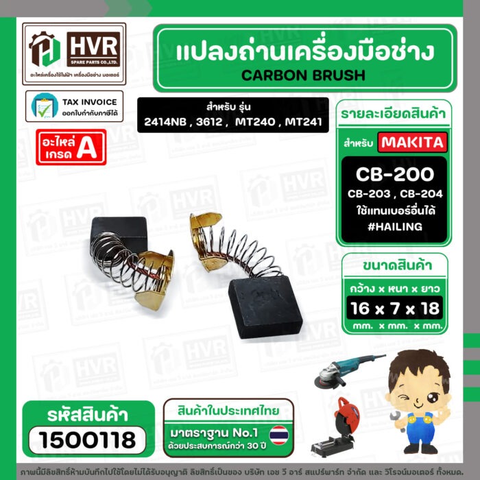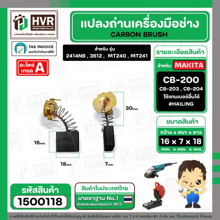 แปรงถ่าน สำหรับ MAKITA CB-200 , CB-203 , CB-204 ( HAILING ) ( 7 x 18 x 16 mm. )(ราคา / 1 ชุด) #1500118