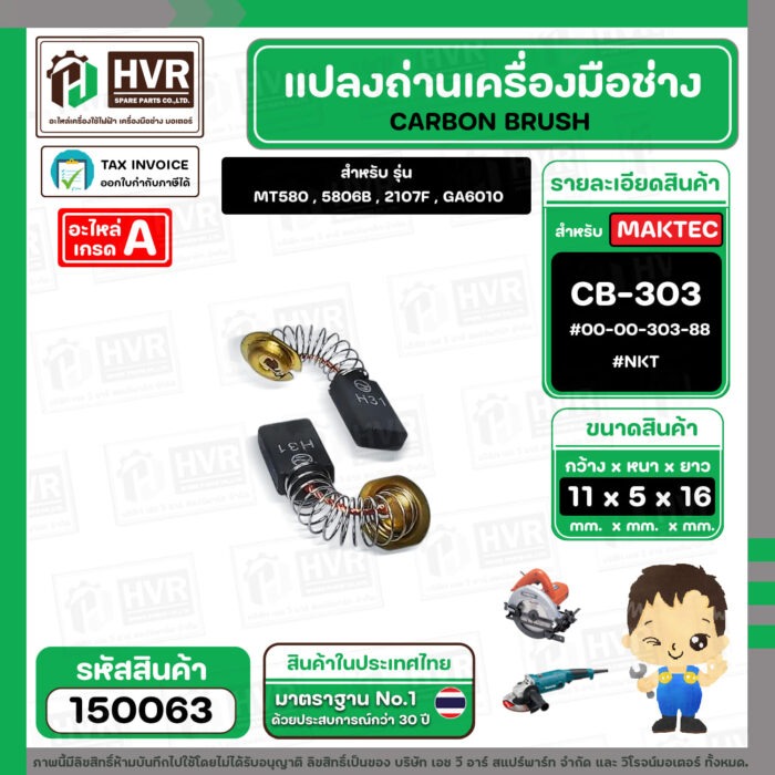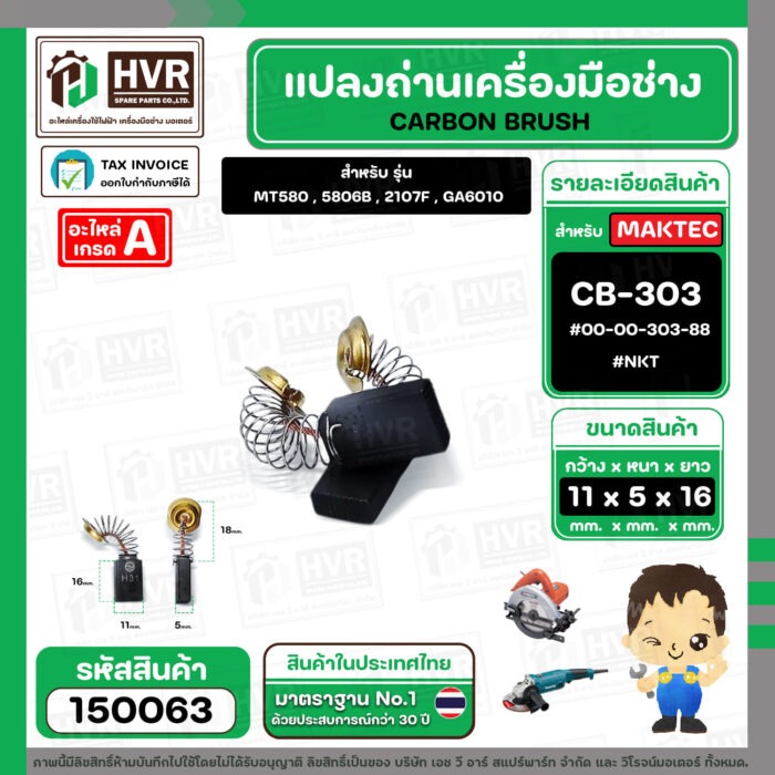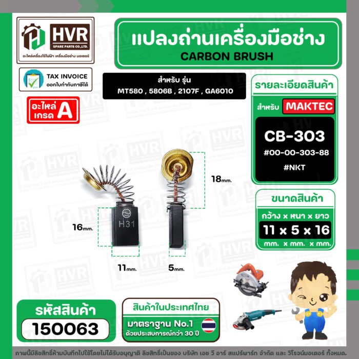แปรงถ่าน สำหรับ MAKITA CB-303 ( NKT ) ( 5 x 11 x 16.7 mm. ) #00-00-303-88 (ราคา / 1 ชุด) #150063
