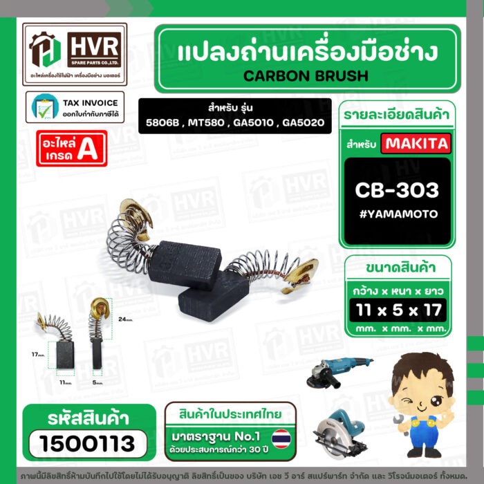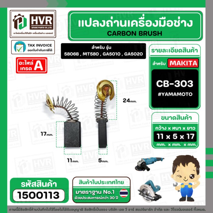 แปรงถ่าน สำหรับ MAKITA CB-303 ( YAMAMOTO ) ( 5 x 11 x 16.7 mm. )(ราคา / 1 ชุด)