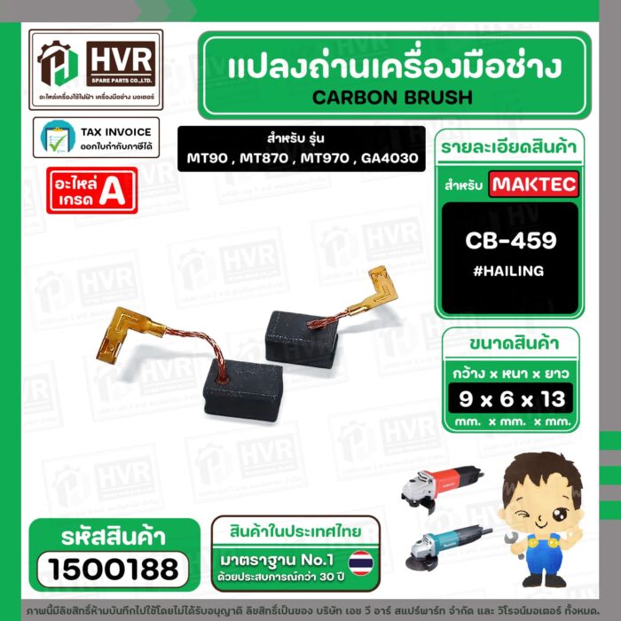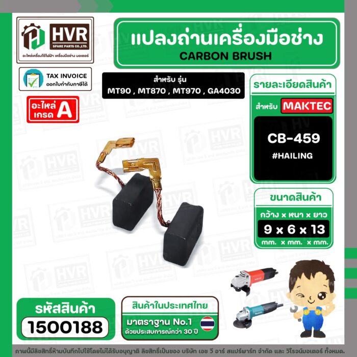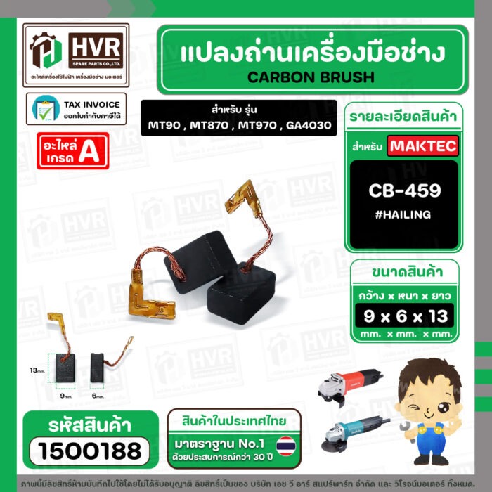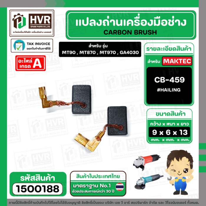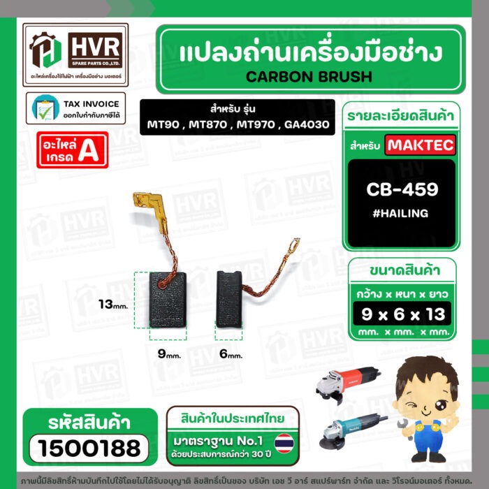 แปรงถ่าน สำหรับ MAKITA CB-459 ( HAILING ) ( 6 x 9 x 13 mm. ) MT90 , MT870 , MT970 , GA4030 , GA4031 , M0910B (ราคา / 1 ชุด) #1500188