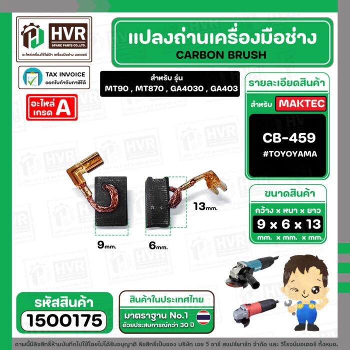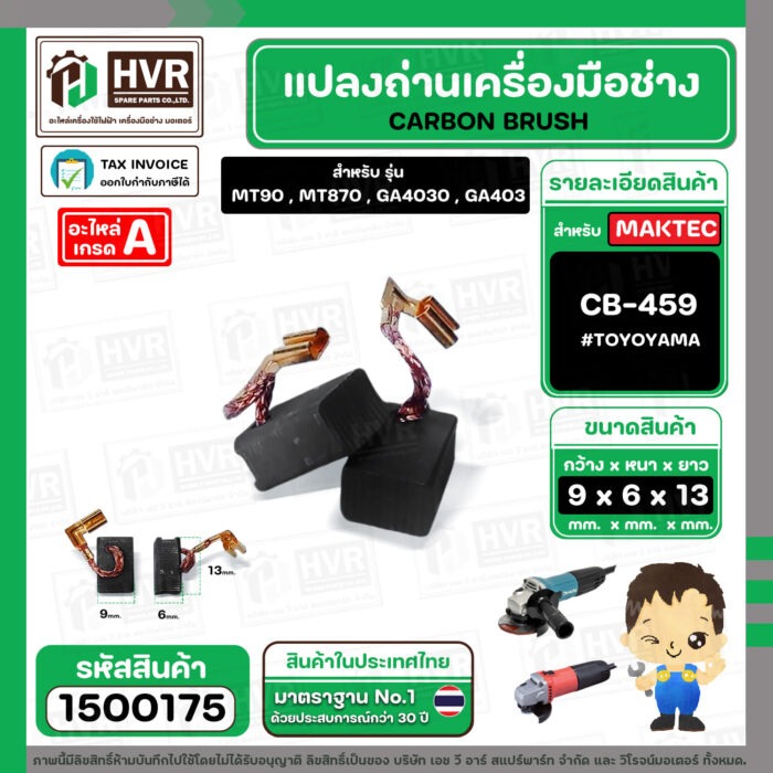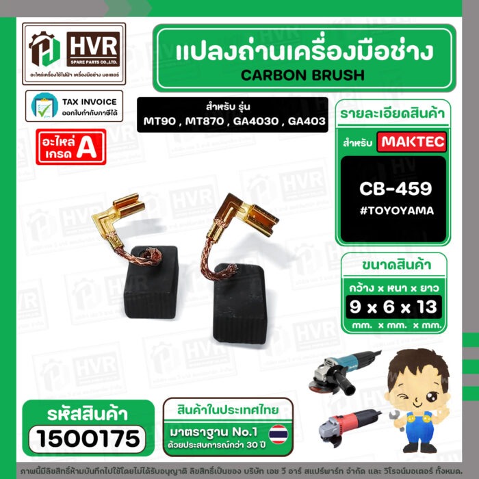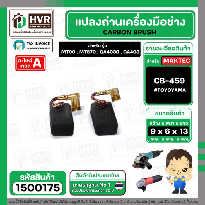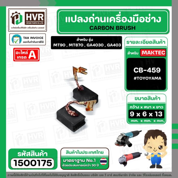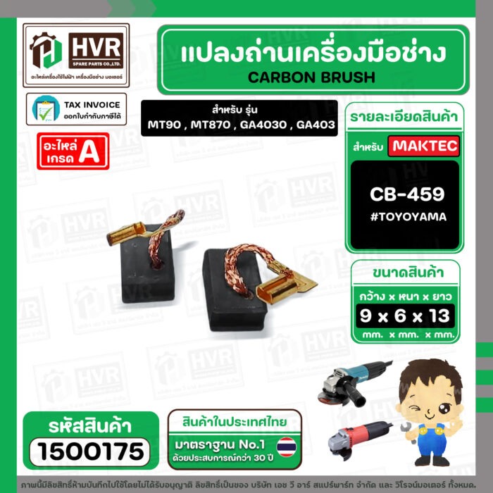 แปรงถ่าน สำหรับ MAKITA CB-459 ( TOYOYAMA ) ( 6 x 9 x 13 mm. )(ราคา / 1 ชุด) #1500175