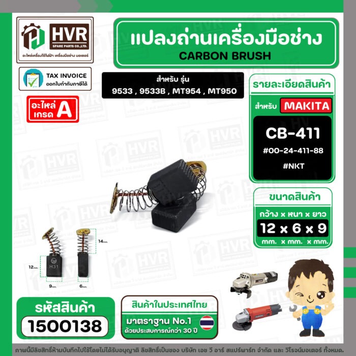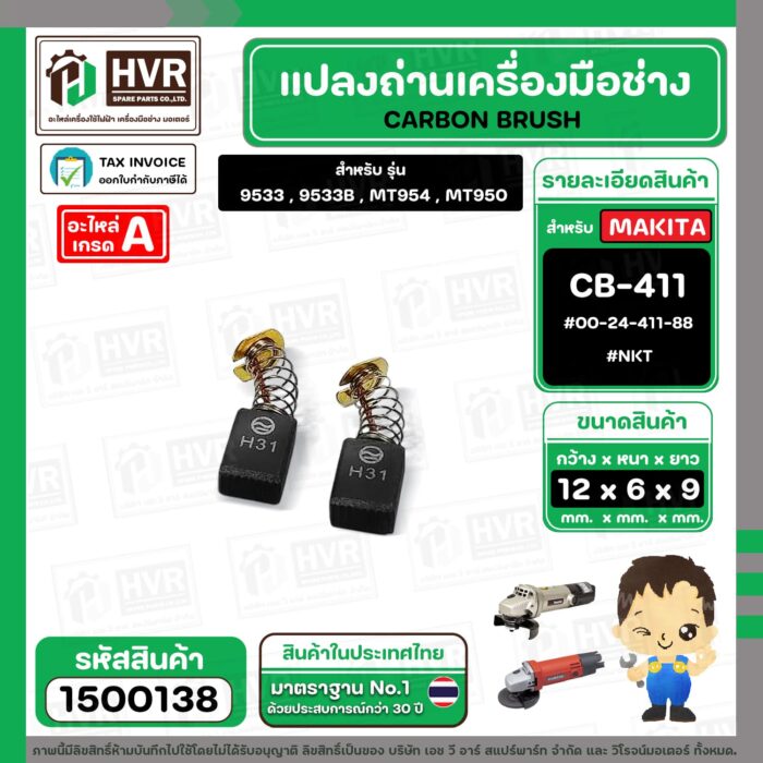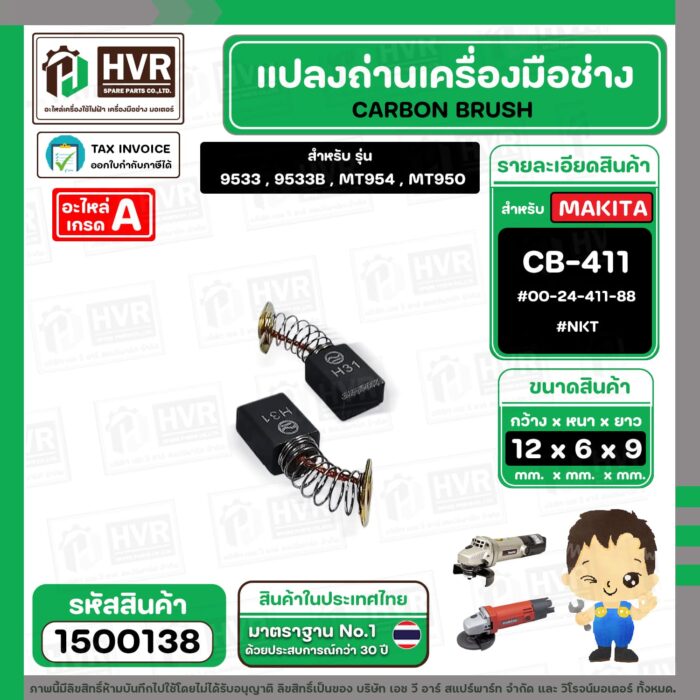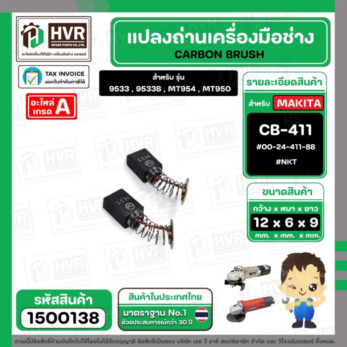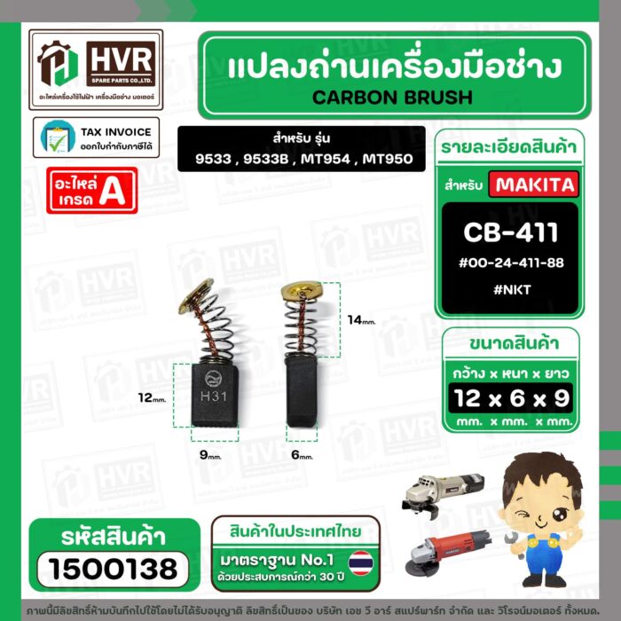 แปรงถ่าน สำหรับ MAKITA MT954 , MT950 ( CB-411 ) ( NKT) ( 6 x 9 x 12 mm. ) #00-24-411-88 (ราคา / 1 ชุด) #1500138