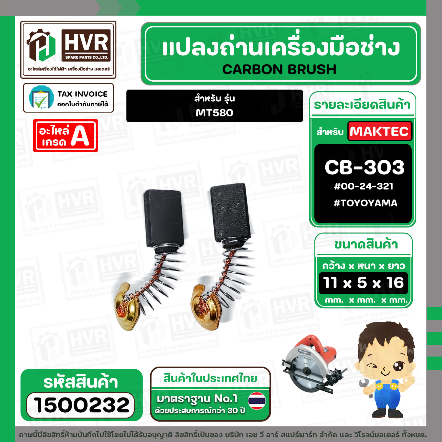 แปรงถ่าน สำหรับ MAKTEC MT580 ( CB-303 ) ( TOYOYAMA ) ( 5 x11 x 16.7 mm. ) #00-24-321 (ราคา / 1 ชุด) #1500232