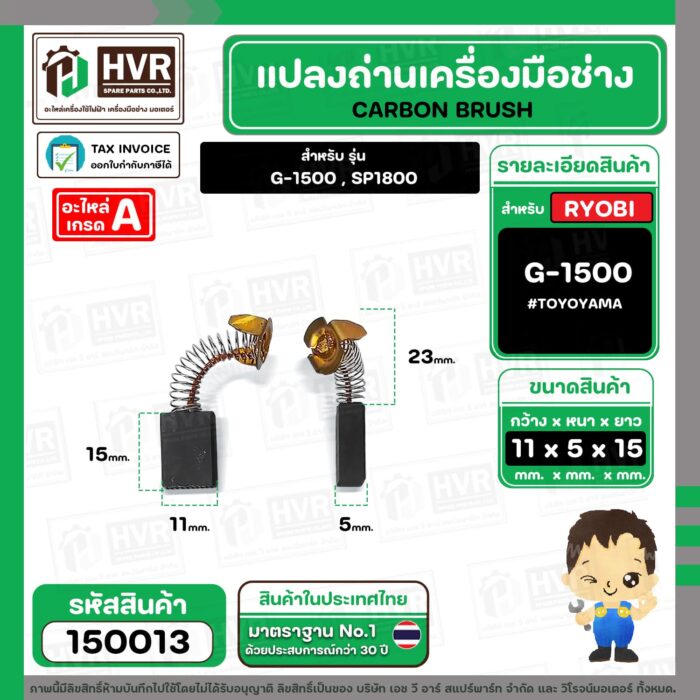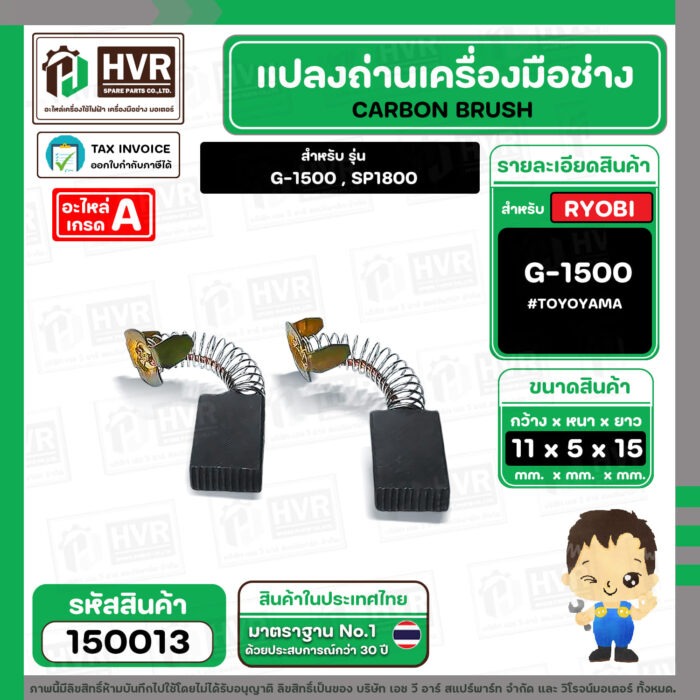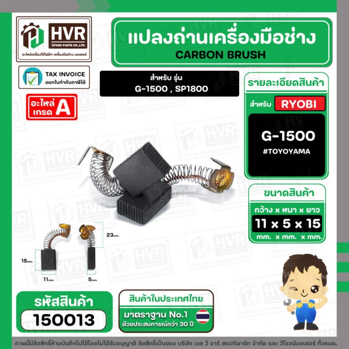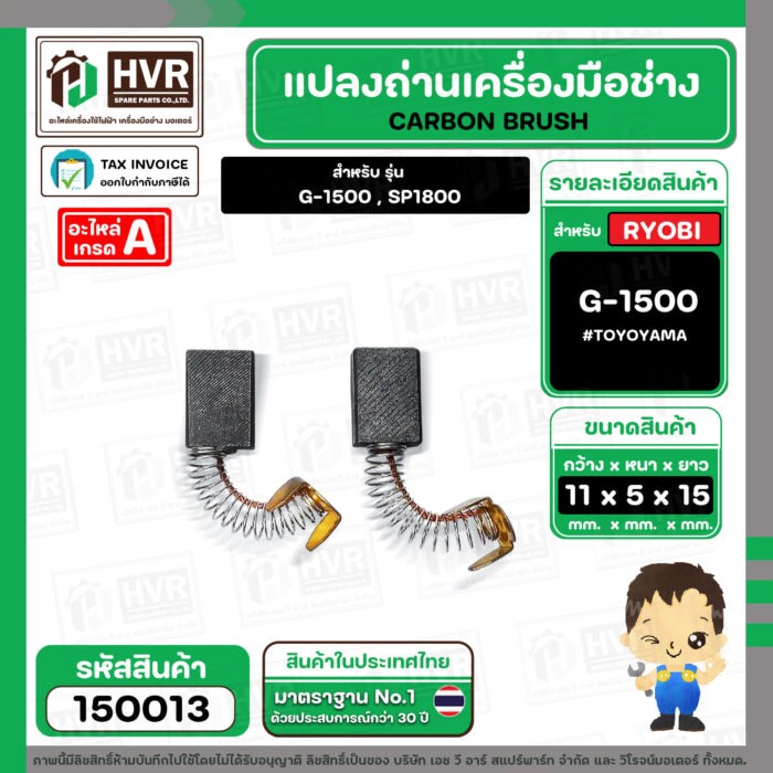 แปรงถ่าน สำหรับ RYOBI 5 ” G-1500 ( TOYOYAMA ) ( 5.3 x 11 x 15.2 mm. ) #00-02-073 (ราคา / 1 ชุด) #150013