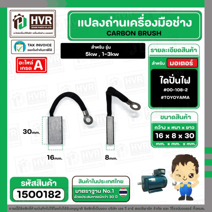 แปรงถ่าน ไดปั่นไฟ 8 x 16 mm. ( TOYOYAMA ) ( 5/16″x 5/8 x 1-3/16″ ) #00-108-2 (ราคา / 1 ชุด) #1500182