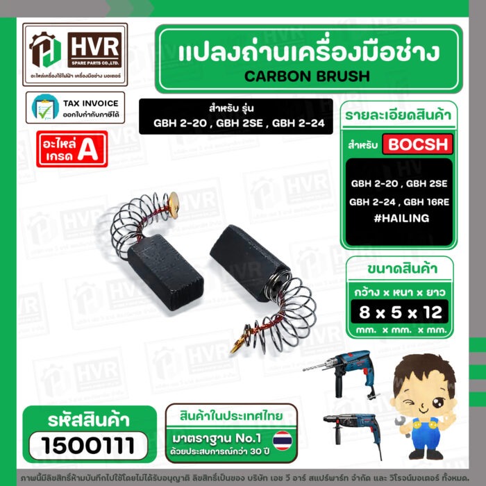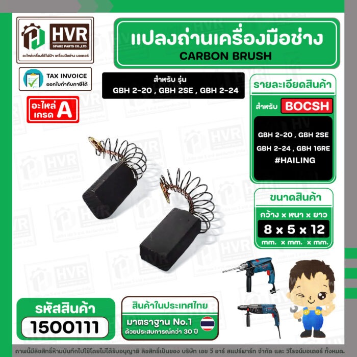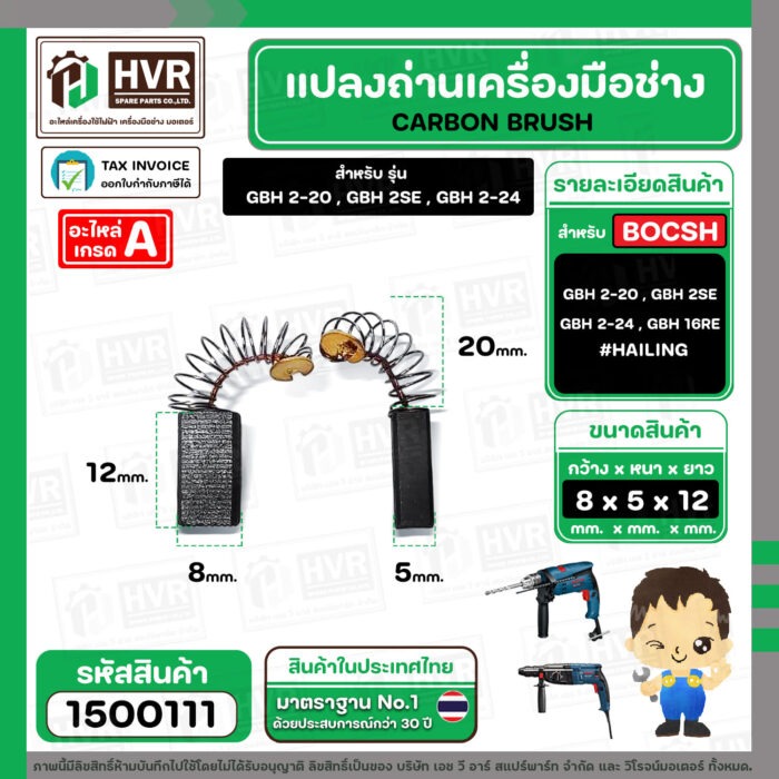แปรงถ่าน BOSCH GBH 2-20 , 2SE , 2-24 , 16RE , หินเจียรจีน ( HAILING ) ( 5 x 8 x 12 mm.) ( 020 ) (สปริง )(ราคา / 1 ชุด) #1500111