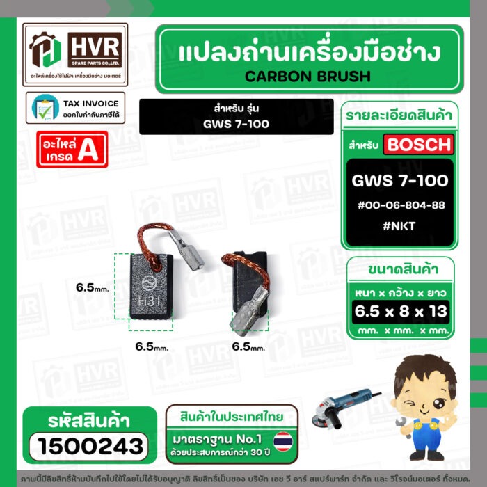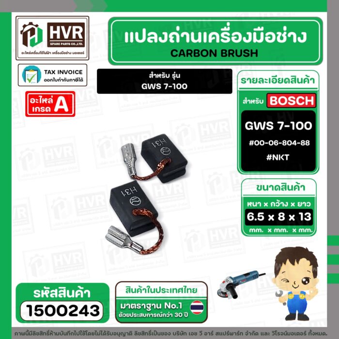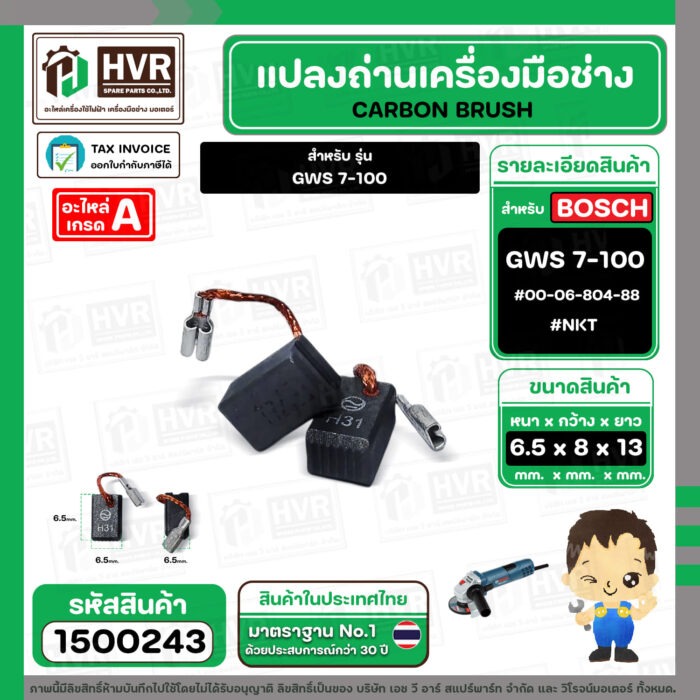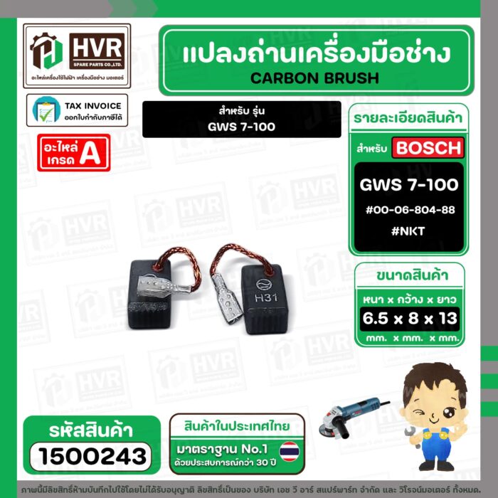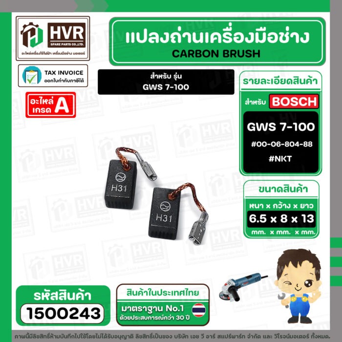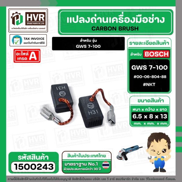 แปรงถ่าน BOSCH GWS 7-100 ( NKT ) ( 6.5 x 8 x 13 mm. ) #00-06-804-88 (ราคา / 1 ชุด) #1500243
