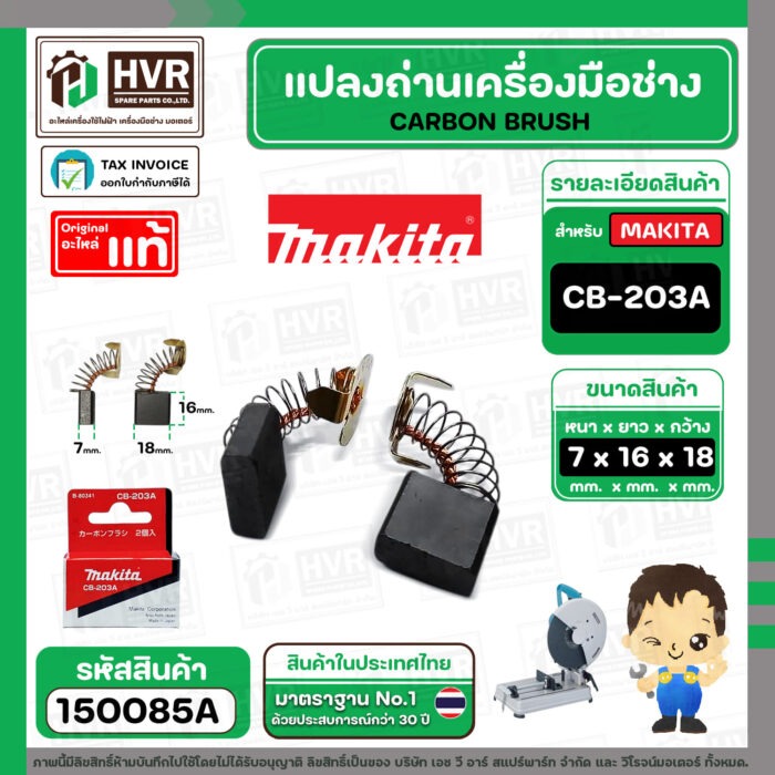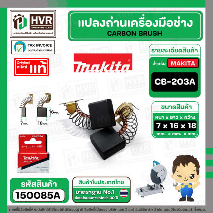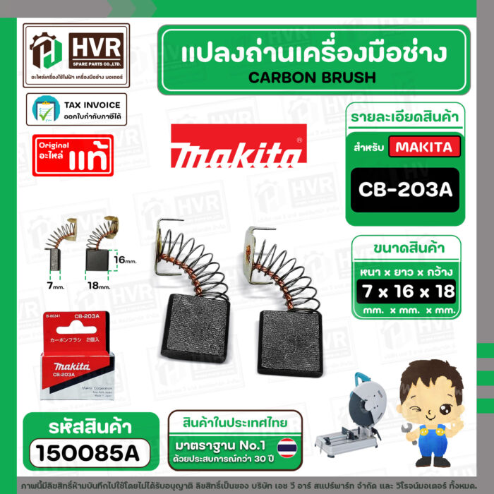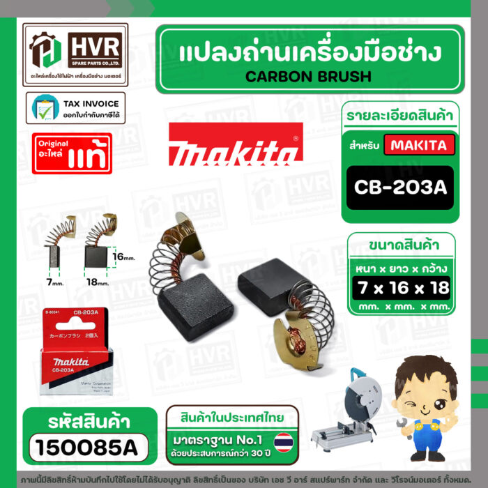 แปรงถ่าน CB-203A ( MAKITA ) ( 7 x 18 x 16 mm. ) ( B-80341 ) ( แท้ ) #Carbon BRUSH (ราคา / 1 ชุด) #150085A