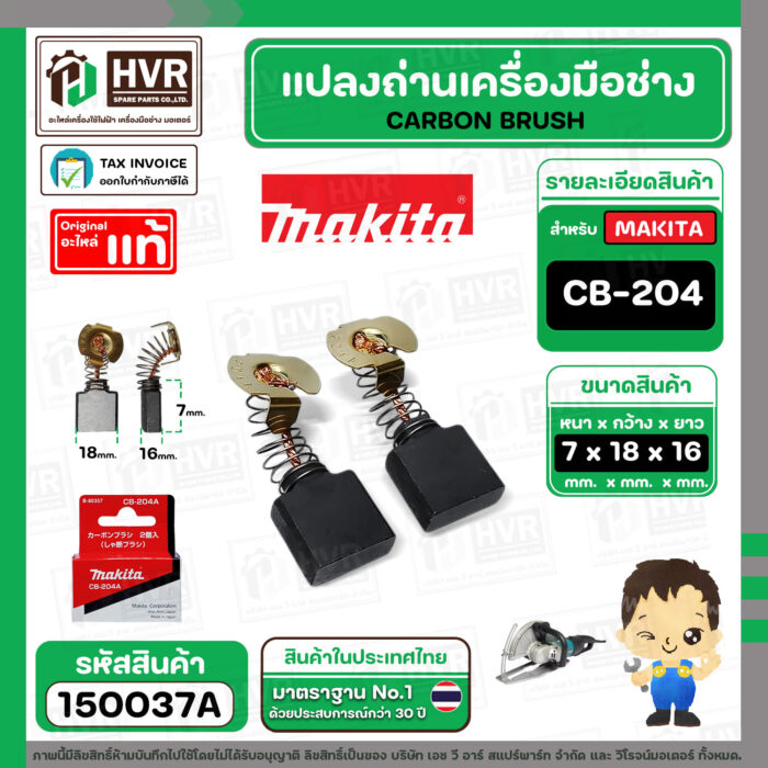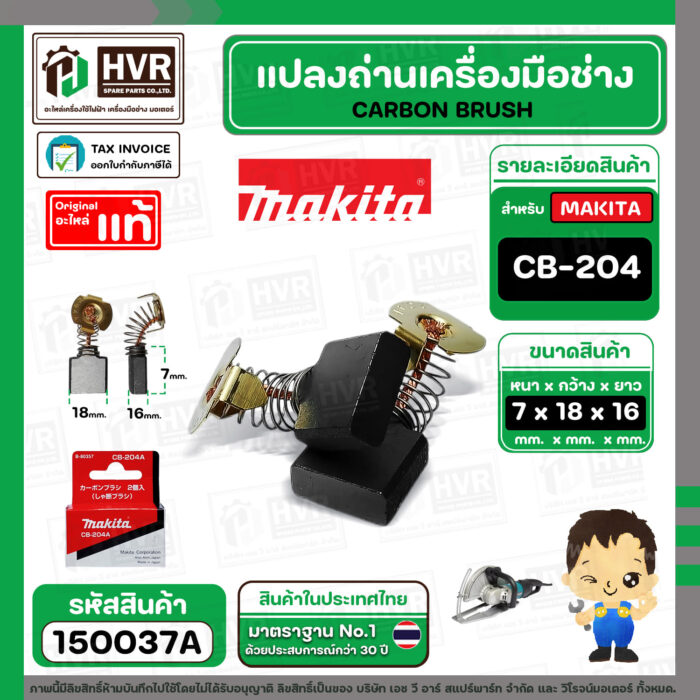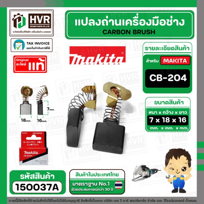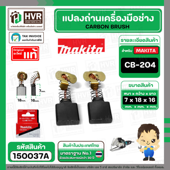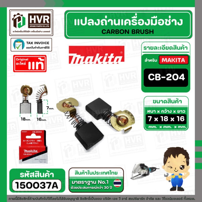 แปรงถ่าน CB-204A ( MAKITA ) ( 7 x 18 x 16 mm. ) ( แท้ ) #Carbon BRUSH (ราคา / 1 ชุด) #150037A