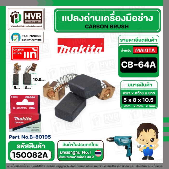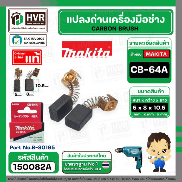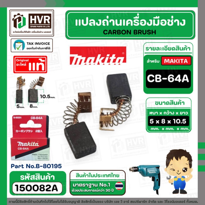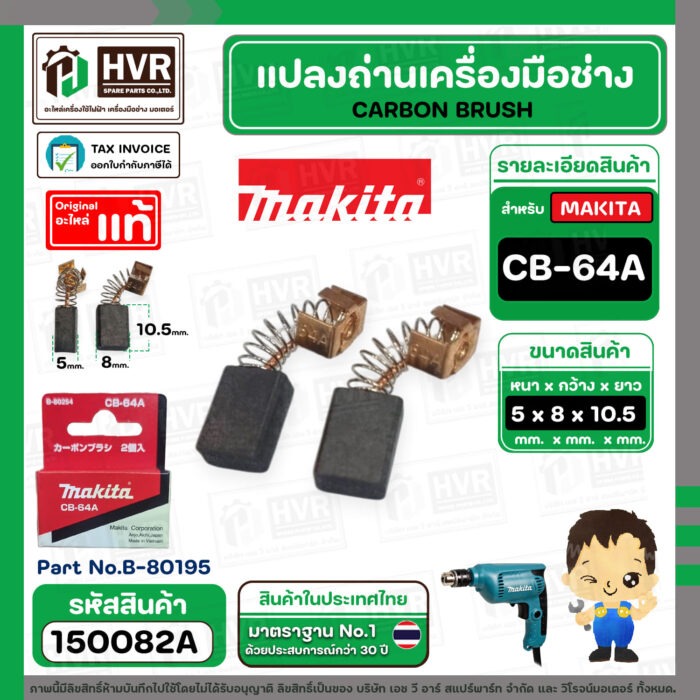 แปรงถ่าน CB-64 ( Makita ) ( 5 x 8 x 10.5 mm. ) ( B-80195 ) ( แท้ ) #Carbon BRUSH (ราคา / 1 ชุด) #150082A