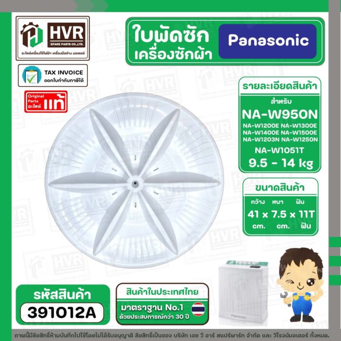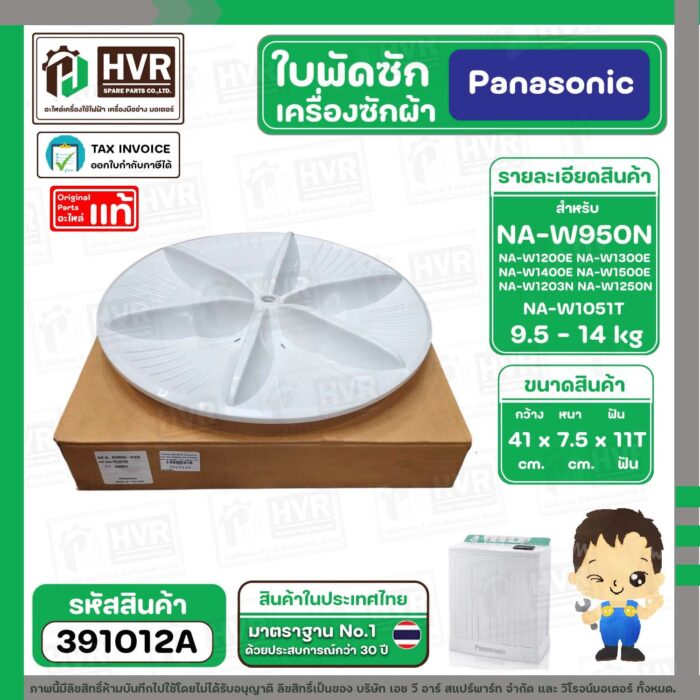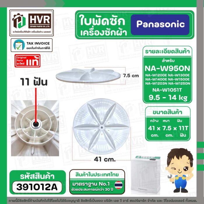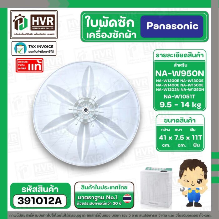 ใบพัดซักเครื่องซักผ้า Panasonic 2 ถัง NA-W950N NA-W1051T NA-W1300E ( แท้ ) ( สีขาว 11 ฟัน 41 cm. ) #391012A
